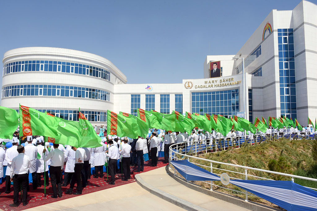 The city of Mary has hosted the opening ceremony of a Children’s Hospital, timed to coincide with Medical Workers’ Day. Thanks to the meaningful health-care reforms, our country’s health system has been brought in line with global standards, and modern diagnostic and treatment centers, health resorts, pharmaceutical enterprises have been built countrywide as part of the state programs. This makes qualified medical care widely accessible to the people. On April 30, 2015 the President of Turkmenistan signed a Decree on the Construction of a Children’s Hospital in Mary to improve and upgrade medical facilities, ensure mother and child welfare and provision of medical care with the application of advanced health care technologies and innovations, as well as to implement the Memorandum of Understanding between the Khalifa Bin Zayed Al Nahyan Foundation (UAE) and the Ministry of Health and Medical Industry of Turkmenistan. The official visit by President Gurbanguly Berdimuhamedov to the United Arab Emirates in March 2018 represents a significant landmark in the advancement of Turkmen-Emirati cooperation. In the course of the summit talks, the head of Turkmenistan and Abu Dhabi’s Crown Prince, Deputy Supreme Commander of the UAE’s Armed Forces Sheikh Mohammed bin Zayed Al-Nahyan discussed the implementation of the Children’s Hospital project in Mary, among other matters. The new health-care facility, which has officially opened its doors today, is intended to render medical services to young patients living in Mary velayat. The Hospital boasts the departments of surgery, gastroenterology, neurology, cardiorheumatology, intensive care and anesthesiology, diagnostics and medical consultations, radiology, as well as an admissions division, laboratory and blood bank. Different doctors, such as an ophthalmologist, otolaryngologist, cardiologist, urologist, orthopedic traumatologist, hearing specialist, and others will see and consult patients. The department of diagnostics and medical consultations is well equipped with an electroencephalograph, X-ray machine, tomograph, fiber optic video bronchoscope, fiber gastroscope, ECG machine, and other up-to-date equipment. The physiotherapy room boasts last-generation electrotherapy, phototherapy and heat therapy machines (UHF-therapy, electrophoresis, Quartz lamp therapy, etc.) The newly-built medical institution is tooled with highly accurate diagnostic and treatment equipment from the biggest foreign companies, specializing in medical devices, and is supplied with all necessary medical instruments specially designed for children. Single-bed and two-bed wards have everything necessary for patients’ comfort. The opening ceremony of the modern Children’s Hospital, which turned into an impressive festivity, was attended by medical workers, representatives of local authorities, elders, young people and scores of residents. Director General of the Khalifa Bin Zayed Al Nahyan Foundation Mohammed Al Khouri was the guests of honor at the ceremony.