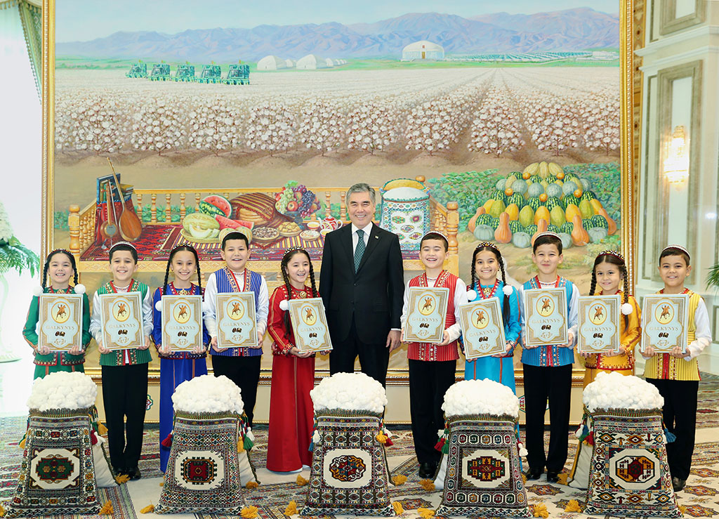 Khyakims of Ahal, Balkan, Lebap, Mary and Dashoguz Velayats reported to President Gurbanguly Berdimuhamedov on the successful fulfillment of contractual obligations. Agricultural workers picked up over 1.050 million tons of ‘white gold’. Children – the young envoys, representing the regions of Turkmenistan congratulated the Turkmen leader on the labor victory achieved by agricultural workers of the country. Thanking the children for the congratulations, the President of Turkmenistan presented gifts to them and took a photo with them. Then the Chairperson of the Mejlis, the Deputy Chairmen of the Cabinet of Ministers, the leaders of the military and law enforcement agencies of the country, the khyakims of the velayats and the city of Ashgabat congratulated the President of Turkmenistan on the labor victory achieved by cotton producers of our country. Addressing all those present, President Gurbanguly Berdimuhamedov noted that during the years of independence, agricultural sector as well as other sectors of economy, has developed significantly. The transformations carried out in this industry provide positive results. Peasant associations, tenants and private entrepreneurs are provided with the necessary equipment, fertilizers and seeds, and new jobs are created on sites. As a result, the competitiveness of the agro-industrial complex increases, which is clearly reflected in satisfying the demands of the local population in high-quality domestic food products. Underlining that one of the key aspects of the state policy is maintaining food abundance in the country, the President of Turkmenistan focused on the importance of import substitution and widening of the export opportunities of the country, further comprehensive development of poultry farming, animal husbandry, and increasing fruit and vegetable production. Among the relevant areas of future work, the President outlined the introduction of a digital electronic management system into the industry. Once again congratulating cotton growers and all agricultural workers on the labor victory and the Harvest Festival, President Gurbanguly Berdimuhamedov wished them good health, family well-being, and new achievements.