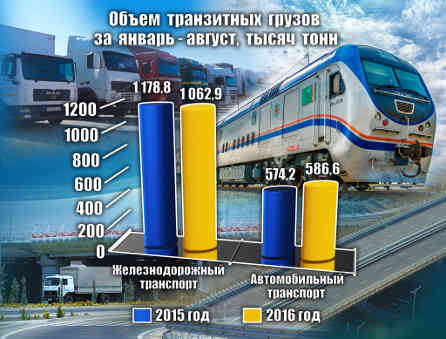 Важнейшей задачей для национальной экономики Президент Гурбангулы Бердымухамедов поставил вывод отечественной продукции на внешние рынки и расширение торгово-экономических связей нашей страны с зарубежными партнерами. Это во многом зависит от степени вовлеченности Туркменистана в глобальную и региональную транспортно-коммуникационную системы, являющиеся материальной базой и инструментом товарообмена между государствами. В данной связи в нашей стране ведется активное расширение логистической сети, реализуются проекты по транспортному обеспечению торговых взаимосвязей и прокладке маршрутов, которые смогут принять на себя растущие объемы транзитных грузопотоков в направлении Европа – Азия и обратно. По данным Государственного комитета по статистике, за январь-август 2016 года через территорию нашей страны было транспортировано свыше 1,7 миллиона тонн транзитных грузов. Преобладающая часть их перевозилась железнодорожным (61,5 процента) и автомобильным (34 процента) транспортом. За этот же период через территорию Туркменистана проследовало 31,3 тысячи единиц грузовых автомобилей, что на 6,2 процента больше, чем за соответствующий период 2015 года. Наибольшую их долю занимали автомобили Турции – 52,3 процента и Ирана – 37,2 процента. Объём услуг, оказанных за перевозки транзитных, экспортных и импортных грузов железнодорожным транспортом, в январе–августе 2016 года составил 122,9 миллиона долларов США, в том числе за транзитные перевозки – 74,5 миллиона долларов США, за экспортные – 42,3 миллиона долларов США, импортные – 6,1 миллиона долларов США. Общий объем данных услуг по сравнению с январем–августом 2015 года вырос на 8,8 процента. Это произошло, в основном, за счет увеличения на 7,2 процента объемов услуг за перевозку транзитных грузов, которые в общем объеме услуг по перевозке грузов занимают 60,6 процента, а также за счет роста объема экспортных грузов на 43,8 процента. В то же время на 56,4 процента сократился объем услуг по перевозке импортных грузов, что является следствием успешно реализуемой государственной программы по замещению зарубежной продукции отечественными товарами. Главной целью государственной транспортной политики лидером нации Гурбангулы Бердымухамедовым определено формирование высокоэффективной национальной транспортной системы, призванной обеспечить удовлетворение спроса на перевозки грузов и пассажиров, повышение их безопасности и качества, создание условий для инвестиционной активности, роста конкурентоспособности отечественных перевозчиков на внутреннем и внешнем рынке транспортных работ и услуг. За январь–август 2016 года всеми видами транспорта (кроме трубопроводного) перевезено более 6 миллионов тонн экспортных грузов, что на 6,7 процентов больше, чем за аналогичный период 2015 года. Экспортные перевозки осуществлялись водным транспортом (52,1 процента), автомобильным (29,6 процента), а также железнодорожным (18,2 процента) и воздушным транспортом (0,1 процента). Импортных грузов за январь–август 2016 года перевезено в объеме более 3,1 миллиона тонн, что на 25,3 процента меньше, чем за соответствующий период 2015 года. В их перевозках основная доля приходилась на автомобильный транспорт (51,7 процента). Железнодорожный транспорт занимал 34 процента, водный – 14,1 процента и воздушный транспорт – 0,2 процента. По с