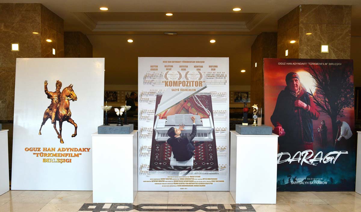 Перед началом торжества собравшиеся ознакомились с развёрнутой в фойе кинотеатра выставкой, рассказывающей об истории и развитии национального кинематографа. Магическая сила киноискусства оказывает большое влияние на зрителя, поэтому экспозиция, в которой представлены различные технические средства для создания кинопроизведений, включая камеры, осветительное оборудование и другие инструменты разных эпох, привлекла внимание посетителей. Также в числе ценных экспонатов – коллекция призов и наград, которыми в разные годы отмечались достижения туркменского киноискусства. Отныне к этой почётной галерее добавились и новые международные награды.
