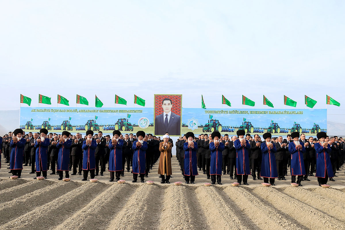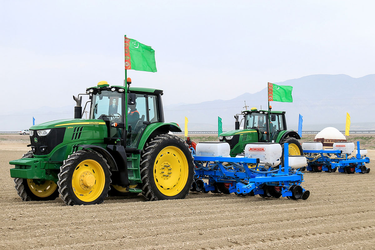 По доброй народной традиции почтенные старейшины, вознеся к Всевышнему молитву о благополучии и процветании Отчизны, туркменского народа, главы государства, бросили в землю первые семена хлопчатника, а затем уступили место механизаторам.