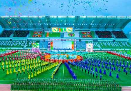 На центральном стадионе спорткомплекса «Ашхабад» состоялось представление, посвященное Дню независимости. Шоу открыли знаменитые ахалтекинцы – многовековая гордость и достояние туркменского народа. Двадцать пять скакунов воплощают своеобразную «кавалерию» славы всех лет, прошедших под знаменем независимости. Туркменистан становится признанным мировым центром в этой сфере. Лидирующие позиции занимают «райские» кони и в искусстве цирковой джигитовки, свидетельством чему являются многочисленные награды группы национальных конных игр «Галкыныш». Сегодня призёры международных смотров - также в числе участников торжества. В продолжающееся праздничное действо вливаются детские и юношеские танцевальные коллективы. Детвора закружилась в веселом хороводе, представляя различные национальные игры. Затем на арене разворачивается выступления туркменских спортсменов. Они демонстрируют десятки видов спорта, в том числе входящих в программу V Азиатских игр в закрытых помещениях и по боевым искусствам, до начала которых остается меньше года. Историческая преемственность поколений, непреходящая значимость богатейшего культурного достояния нации были подчеркнуты в продолжившей праздничную программу литературно-музыкальной композиции. В ходе представления были воссозданы и картины строительства международного газопровода Туркменистан–Афганистан–Пакистан-Индия, реализация которого придаст мощный импульс экономическому развитию региона, будет содействовать укреплению здесь мира и стабильности, и моменты летописи Национальной туристической зоны ""Аваза"" на побережье Каспия. Завершающим аккордом праздника стал танец куштдепди, олицетворяющий сегодня сплоченность туркменского народа и преемственность культурных традиций нации.