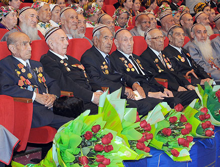 АШХАБАД, 8 мая (TDH). Сегодня, в преддверии празднования 70-й годовщины Великой Победы в войне 1941-1945 годов, в столичном дворце «Мекан» состоялось большое торжество. В этот день под величественными сводами этого дворца, а также театров во всех велаятах страны, в торжественной обстановке от имени Президента Туркменистана ветеранам войны и вдовам погибших воинов были вручены денежные и ценные подарки. Организаторами праздничных мероприятий совместно выступили Центральный совет Организации ветеранов войны Туркменистана, Политсовет Демократической партии, общественные организации, Министерство обороны, Министерство культуры, хякимлики города Ашхабада и велаятов. В Туркменистане глубоко почитают своих героев, с особым вниманием и уважением относятся к ветеранам, солдатских вдовам, труженикам тыла. В эпоху могущества и счастья народные герои всесторонне окружены постоянной заботой со стороны государства, в приоритете которой – здоровье ветеранов, улучшение социально-бытовых условий для них. В необыкновенно теплой атмосфере, проникнутой трепетным чувством глубокой благодарности и уважения к тем, кто приближал День Победы, прошло торжество под сводами Дворца «Мекан». Отдать дань героизму и доблести убеленных сединами героям войны и труда и от всей души поздравить их с великим праздником собрались руководители и представители общественных организаций страны, столичного хякимлика, вузов и школ, деятели культуры, многочисленные ашхабадцы. Выступавшие подчеркивали, что минуло 70 лет со дня Великой Победы, но бессмертна память об именах и подвиге наших доблестных героев, которые вечно будут жить в сердцах туркменского народа, низко склоняющего головы перед смелостью и отвагой защитников родной земли, а также самоотверженных тружениках тыла, которые день и ночь трудились во имя Победы. В свою очередь, ветераны войны выразили безграничную признательность Президенту Гурбангулы Бердымухамедову за постоянную заботу и внимание к участникам войны и вдовам погибших воинов, за его благородную миротворческую деятельность и масштабные прогрессивные преобразования, ныне происходящие на родной земле. Ветераны вспоминали трудные годы военного лихолетья и то, как безграничная любовь к родной земле помогала им выдержать тяжелейшие испытания и выйти победителями в самой кровопролитной войне в истории человечества. Высокий подвиг наших дорогих ветеранов – мужественных героев и защитников Отечества – навсегда останется ярким примером патриотизма для молодежи, самым достойным ориентиром в воспитании нынешних и будущих поколений туркменистанцев в духе искренней любви и преданности Родине. В праздничной атмосфере под звуки торжественной музыки от имени Президента Гурбангулы Бердымухамедова героям торжества - ветеранам войны и вдовам погибших воинов были вручены денежные и ценные подарки, прекрасные букеты весенних цветов. Большую концертную программу подготовили творческие коллективы столицы. Патриотические песни, славящие независимую Родину и ее мужественный народ, звучали в посвящение славным героям Отечества. Украшали волнующую встречу зрелищные танцы, исполненные в честь ветеранов, отстоявших мир для всех нас и приблизивших День Победы. Следует отметить, что мероприятия, посвященные празднику Победы, проводятся во 