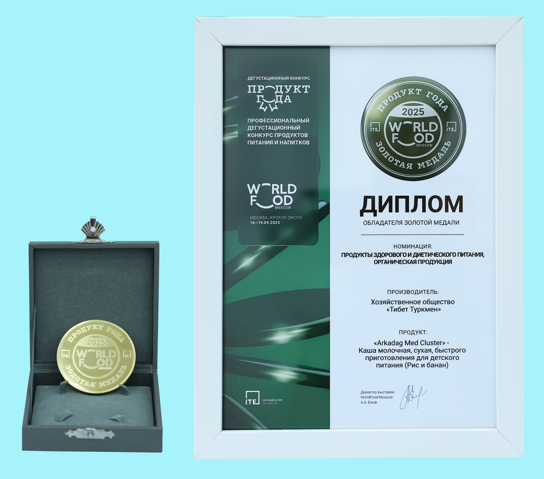 Первым делом Герою-Аркадагу сообщили добрую весть: продукция предприятия «Arkadag Medisina Klasteri Menejment», включая детское питание, удостоилась золотой медали «Продукт года» и соответствующего диплома на прошедшем в Москве в сентябре нынешнего года смотре. Данная награда служит наглядным свидетельством международного признания экологической чистоты товаров, в частности, продуктов для здорового и полноценного питания, выпускаемых отечественными производственными комплексами, в том числе города Аркадаг.