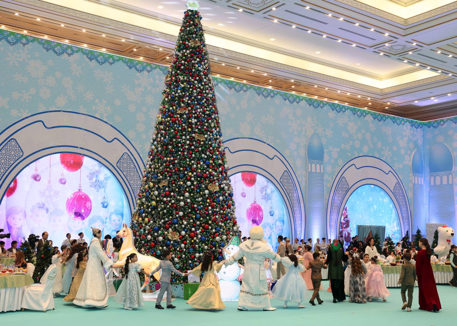 Аркадаглы Герой Сердар проходит в большой зал здания Торгово-промышленной палаты, нарядно оформленный яркими декорациями и новогодней атрибутикой. Вокруг прекрасной ёлки в радостном ожидании новогодней сказки собрались Аяз баба, Гарпамык, символ 2026 года – Лошадь, а также многочисленные юные ашхабадцы в карнавальных костюмах и гости столицы. Все радостно приветствовали главу государства.