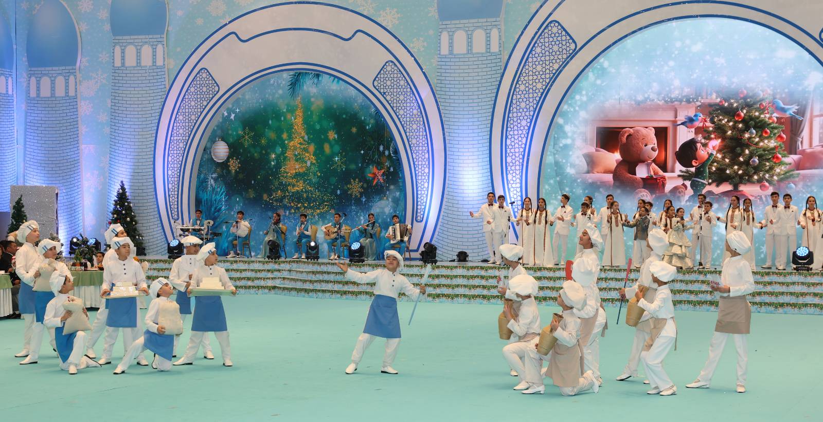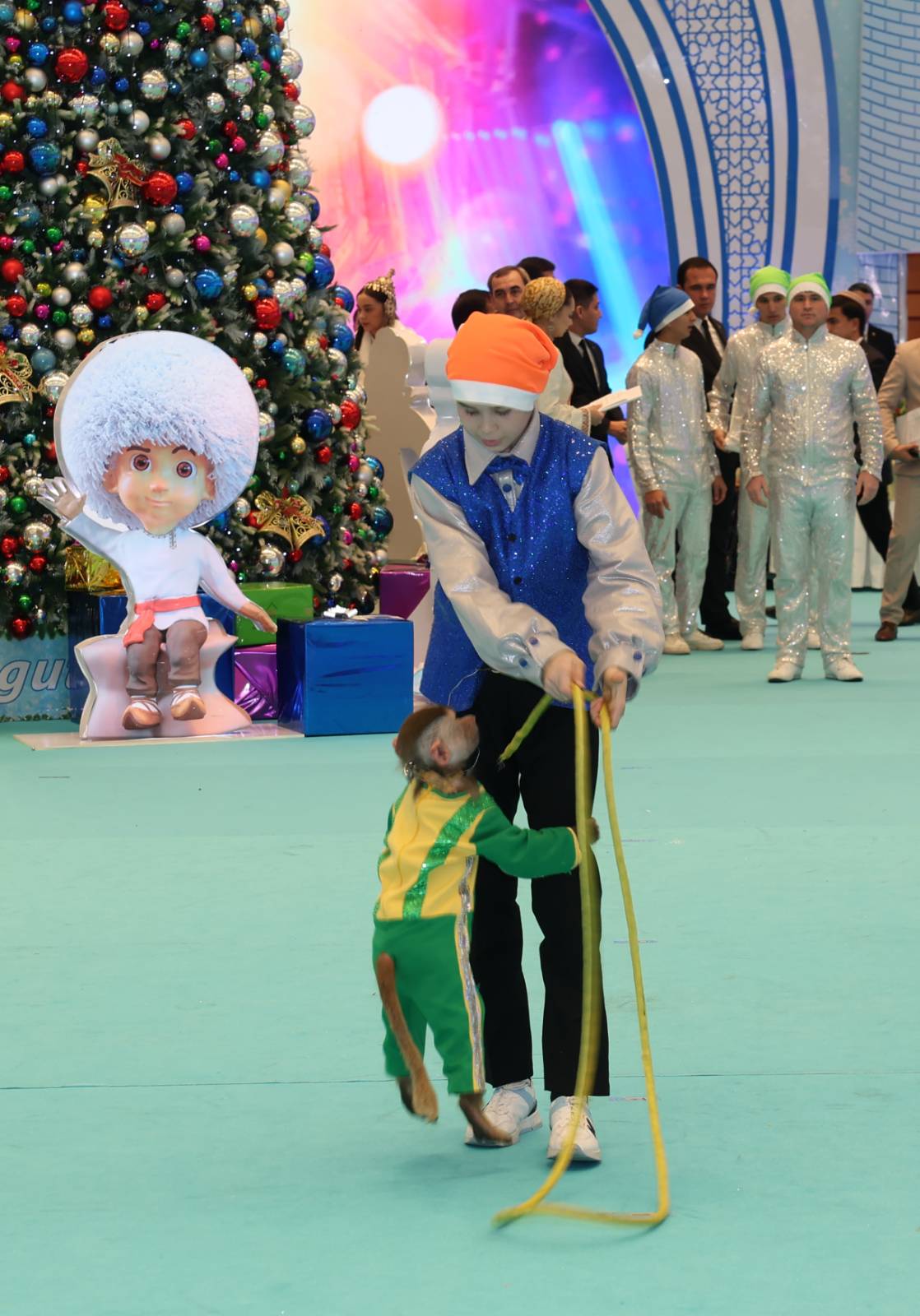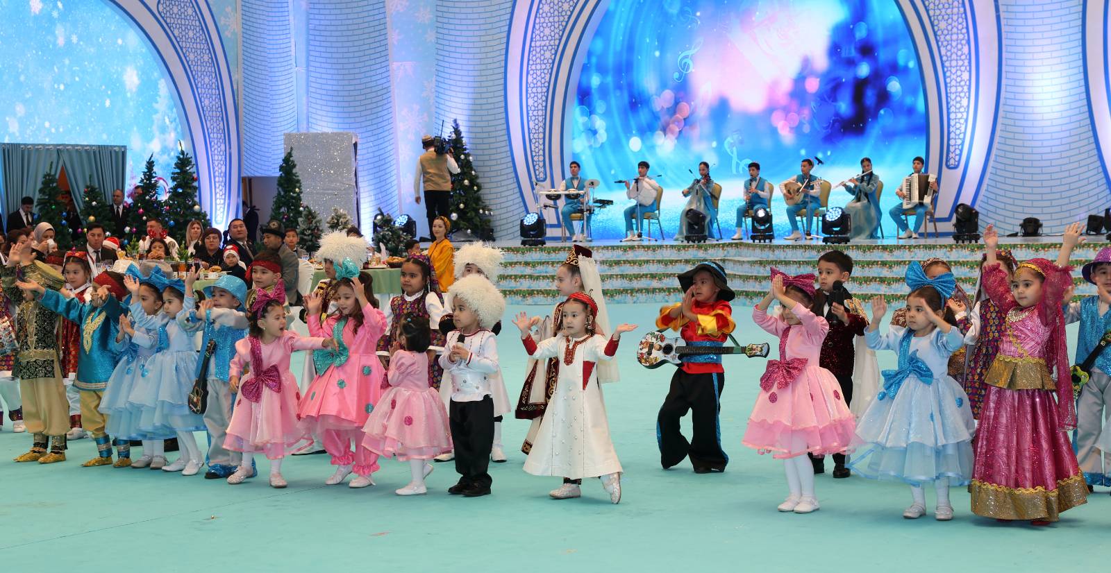 Президент Сердар Бердымухамедов с удовольствием наблюдает за выступлениями артистов эстрады, театров и цирка, фольклорных и танцевальных групп, детских творческих коллективов и талантливых ребят разного возраста, в том числе воспитанников детских садов. На празднично украшенной сцене развернулось грандиозное представление с весёлой музыкой, песнями, зажигательными танцами, ставшими посвящением Новому году.