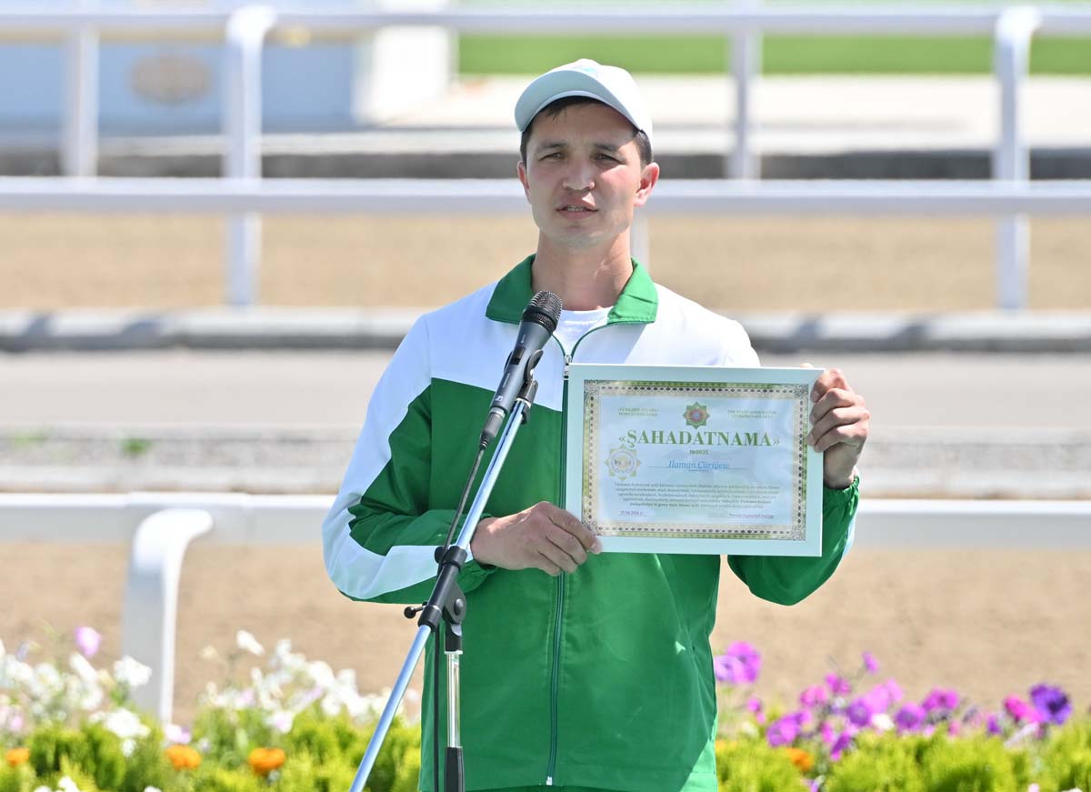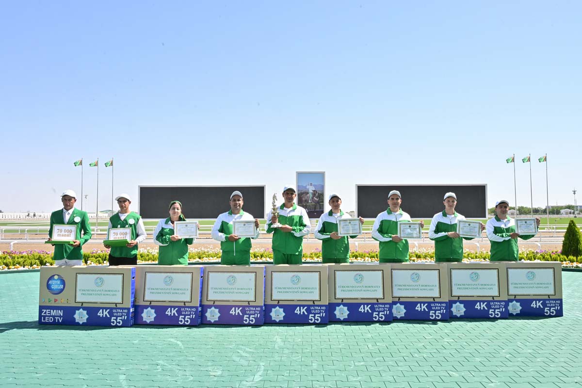 Затем состоялась церемония награждения победителей конного марафона и соревнований по конкуру, проведённых по случаю Национального праздника туркменского скакуна. В конном марафоне 1-го места удостоился скакун по имени Мелегуш, относящийся к хозяйству Б.Баллыева. В соревнованиях по конкуру победителем стал скакун Гудратлы, относящийся к Ахалтекинскому конному комплексу Президента Туркменистана. Победителям были вручены призы отраслевых ведомств страны.