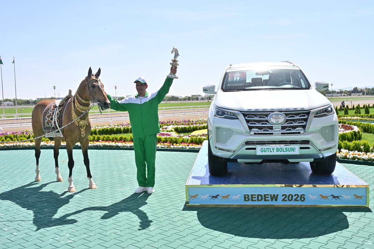 Затем был объявлен победитель международного конкурса «Ýylyň iň owadan ahalteke bedewi». Самым красивым скакуном 2026 года был признан соловый конь по имени Ханкервен, относящийся к Ахалтекинскому конному комплексу Президента Туркменистана, родившийся в 2018 году, потомок Ханбеглер и Окгыз, принадлежащий к линии знаменитого Гаплана.