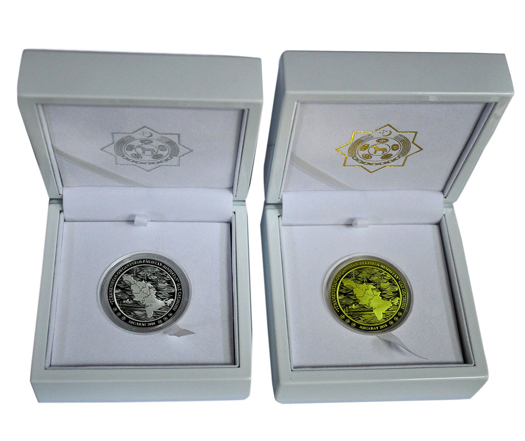 Taryhy wakanyň öňüsyrasynda--Türkmenistan-Owganystan-Pakistan-Hindistan gaz geçirijisiniň owgan böleginiň düýbüniň tutulmagy mynasybetli geçirilen dabaranyň öňýanynda Türkmenistanyň Merkezi banky her haýsysynyň nominaly 100 manada deň bolan altyn we kümüş şaýy pullaryndan durýan ýadygärlik şaýy pullar toplumyny çykardy. Täze şaýy pullar Türkmenistanyň öňden gelýän hyzmatdaşy – Beýik Britaniýanyň “Royal Mint” zikgehanasynda ýasaldy. Şaýy pullaryň ikisiniň hem ýüz tarapynyň merkezinde içki tegelekde çäge aňňatlarynyň fonunda TOPH taslamasyna gatnaşyjy döwletleriň kartalary şekillendirilen. Bu kartalarda TÜRKMENISTAN, OWGANYSTAN, PAKISTAN, HINDISTAN diýlip degişlilikde her ýurduň türkmen dilinde öz ady ýazylan. Şol ýerde gaz geçirijiniň her ýurtdaky kesgitlenen nokady we gaz geçirijiniň ugry görkezilen. Bu ugruň ýoly bilen, Beýik Ýüpek ýoluny alamatlandyrýan düýeli kerwen şekillendirilen. Içki tegelegiň ýokarky böleginde, gaz geçirijiniň ýoly bilen çekilmegi meýilleşdirilýän elektrik geçiriji ulgamy ýerleşdirilen. Içki tegelegiň aşaky böleginde uly diametrli turba görnüşinde gaz geçiriji şekillendirilen. Çep tarapda esasy turbanyň şahasyndan çykyp duran alawyň suraty bar. Şeýle hem, gaz geçirijiden ýokarrakda çepden saga gönükdirilen, bir tarapy uçgun görnüşinde Hindistanyň kartasynda gutarýan optiki-süýümli kabel şekillendirilen. Daşky tegelekde aýlaw bilen “TÜRKMENISTAN-OWGANYSTAN-PAKISTAN-HINDISTAN GAZ GEÇIRIJISI”, aşaky böleginde “AŞGABAT 2018” diýlen ýazgylar ýerleşdirilen. Şaýy pullaryň ikisiniň hem arka tarapynyň merkezi böleginde Türkmenistanyň Döwlet tugrasy ýerleşdirilen, onuň daşyndan puluň ýokarky böleginde aýlaw bilen “TÜRKMENISTANYŇ MERKEZI BANKY” diýlen ýazgy, aşaky böleginde şaýy puluň nominalyny görkezýän “ÝÜZ MANAT” diýlen ýazgy şekillendirilen. Şeýle hem bu ýerde şaýy puluň mähegi we agramy görkezilen. Ýazgylar öz aralarynda sekizburçly ýyldyz görnüşindäki şekiller bilen bölünen. Şaýy pullaryň diametri 38,61 mm bolup, 916,7 mähekli altyndan, 925 mähekli kümüşden ýasaldy. Olaryň agramy degişlilikde 39,94 gr we 28,28 gr deňdir. Olara goşulýan Türkmenistanyň Merkezi bankynyň sertifikaty şaýy pullaryň “pruf” hilini kepillendirýär. Gymmat bahaly metallardan ýasalan şaýy pullary ýurdumyzda döredilýän numizmatiki toplumynyň üstüni ýetirer hem-de ýurdumyzyň we daşary döwletleriň köp sanly pul ýygnaýjylary üçin ajaýyp sowgat bolar.