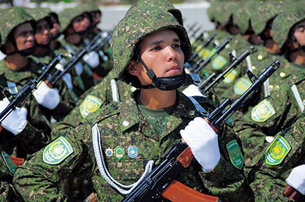 Kelete, 30-njy aprel (TDH). Şu gün “Kelete” okuw türgenleşik merkezinde “Watan gerçegi” atly harby okuw-türgenleşigi geçirildi. Oňa Türkmenistanyň Ýaragly Güýçleriniň düzümlerinde ot atyş taýýarlygyny geçen, söweşjeň taýýarlykda aýratyn tapawutlanan mergen harby gullukçylar gatnaşdylar. Olar bu gün söweşjeň taýýarlyklarynyň ýokarydygyny görkezmegi öz öňlerinde maksat edindiler. Berkarar döwletimiziň bagtyýarlyk döwründe milli goşunymyzyň harby kuwwaty we söweşjeň ukyby Türkmenistanyň Prezidenti, Türkmenistanyň Ýaragly Güýçleriniň Belent Serkerdebaşysy, goşun generaly Gurbanguly Berdimuhamedowyň bu ugurdaky yzygiderli tagallalary netijesinde barha ýokarlanýar. Ýurdumyzyň goranyş häsiýetli Harby doktrinasyna laýyklykda, gury ýerde, howa we deňiz giňişliginde sazlaşykly hereket etmäge ukyply ýurdumyzyň Ýaragly Güýçleri ussat harby hünärmenleri taýýarlaýan kämil mekdebe öwrüldi. Harby okuw-türgenleşikleriniň geçirilmeginiň maksady harby gullukçylarymyzyň hünär derejesini hem-de milli goşunymyzyň diňe parahatçylyk maksatlaryna hyzmat edýän goranyş kuwwatyny ýokarlandyrmakdan ybaratdyr. Harby okuw- türgenleşigini ýurdumyzyň Ýaragly Güýçleriniň Harby-howa güýçleri we howa hüjüminden goranmak goşunlary başlady. Häzirki wagtda tehniki taýdan üpjünçiligine aýratyn üns berilýän ýurdumyzyň Harby-howa güýçleri Türkmenistanyň deňiz çäkleriniň we gury ýer serhediniň howa giňişligini ygtybarly goraýar. Tejribeli uçarmanlarymyz howada uçuş tilsimlerini görkezdiler, olar asmandan hüjüm edip, top oklary bilen ýerdäki nyşanalary takyk urup, ot açdylar. Ussat uçarmanlar söweş uçarlaryna kämil erk edip, öňde goýlan wezipäni ýerine ýetirdiler. Soňra howadaky nyşanany ýok etmek boýunça howa hüjüminden goranmak goşunlarynyň güýçleri görkezildi. Şunda 4500 metr beýiklikdäki we 12 kilometr uzaklykdaky howa nyşanasyny ýok etmek üçin Peçora-2BM asmana atyjy raketa toplumynyň şahsy düzümi ot açyp, wezipäni ýerine ýetirdi. “Watan gerçegi” atly harby okuw-türgenleşigini raketa we artilleriýa goşunlary dowam etdi. Söweşjeň tehnikalar uly meýdany eýeleýän nyşanalar boýunça zalp bilen ot açdylar. Tehnikalaryň mergen çeneýjileri ot açylanda bildirilýän talaplary berjaý edip, oklary dogry çenäp gönükdirdiler. Ýeri gelende aýtsak, hormatly Prezidentimiziň durmuşa geçirýän harby özgertmeleriniň netijesinde raketa we artilleriýa goşunlarymyz kuwwatly ýaraglar bilen üpjün edildi. “Smerç”, “Uragan”, “Grad” ulgamlary, söweş maşynlary, özi ýöreýän toplar, top-gaubisalar we mina agtaryjylar olaryň ygtyýaryndadyr. Söweş hereketleri alnyp barlanda, top ýaraglary söweşe ilki başlap, garşydaşa uly zyýan ýetirmek bilen pyýada we tank goşunlarynyň şowly hüjüm etmeklerine amatly şertleri döredýär. Şonuň üçin hem top oklarynyň nyşanany dürs urup, olary hatardan çykarmagy örän möhümdir. Topçular bu wezipä häzirki okuw türgenleşiginiň dowamynda abraý bilen hötde geldiler. Mälim bolşy ýaly, söweş hereketlerinde tanklar esasy urgy güýji bolup, gury ýerde agdyklygy gazanmakda olaryň ähmiýeti örän uludyr. Şol nukdaýnazardan hem garşydaşyň tanklaryna garşy göreşmek üçin MT-12 wzwody ot atyş sepgidini eýeledi hem-de 1000-2500 metr aralykdaky nyşanlara garşy ot açdy. Esgerleriň erjel we ussat hereketleri netijelerinde top oklary nyşana dürs urulýar. Şondan soň, MTLB kysymly zynjyrly çekijiniň üstünde oturdylan pulemýotdan 400 metr aralyga ot açylýar. Soňra garşydaşyň pesden uçýan uçarlaryny we howa nyşanalaryny ýok etmek üçin niýetlenen Gury ýer goşunlarynyň asmana atyjy raketa toplumlary ot atyş sepgitlerini eýeläp, bellenen aralykdaky nyşanalara garşy ot açýar. Netijede howa nyşanasy raketanyň kömegi bilen ýok edildi. Gury ýer goşunlarynyň iň kuwwatly harby tehnikalarynyň biri hem tanklardyr. Dolandyryş nokadynyň sag we çep taraplaryndan T-72 kysymly kuwwatly tanklar ot atyş sepgidi eýelemek üçin okgunly hereket etdiler. Olar hereketde ot açyp, bellenen aralykdaky nyşanany hatardan çykarýarlar. Gury ýer goşunlarynyň BMP kysymly söweş tehnikalary herekete girýär. Bu tehnikalar pyýada goşunyň esasy söweş maşynydyr. Häzirki harby-okuw türgenleşigine gatnaşýan bu söweş tehnikalarynyň şahsy düzümi hem bellenen nyşanalara garşy ot açyp, özleriniň ýokary taýýarlygyny görkezýärler. Soňra goranyşyň öňdäki hatarynda ýerleşen granatamýot atyjylar herekete başlaýarlar. Ilki bilen, SPG-9 tanka garşy granatamýotlardan, soňra RPG-7W hem-de AGS-17 granatamýotlar bilen bellenen nyşanalar boýunça ot açylýar we olar ýok edilýär. “Watan gerçegi” atly şu günki harby okuw-türgenleşigine ýurdumyzyň Ýaragly Güýçleriniň Inžener goşunlarynyň şahsy düzümi hem gatnaşdy. Olaryň wezipesi MTU-20 tanklar üçin köprüni hem-de PMZ-4 tirkegli mina goýujynyň kömegi bilen minaly meýdançany gurnamakdan ybarat boldy. Öňde goýlan wezipe üstünlikli ýerine ýetirilýär. Soňra iň kämil tanklaryň nusgasy hasaplanýan T-90 tanklary dolandyryş nokadynyň çep tarapyndan ýörite gurnalan meýdançada ýokary tizlikde hereket edip, onuň sürüjileri tehnikany dolandyrmakda ussatlygyny görkezýärler. Bu tanklar ýörite gurnalan dürli päsgelçiliklerden ýokary tizlik bilen geçip, islendik çylşyrymly şertlerde hereket etmäge ukyplydyklaryny görkezdiler. Türkmenistanyň Döwlet serhet gullugynyň şahsy düzümi hem geçirilýän şu okuw türgenleşigine gatnaşdylar. Olar COBRA, SURVIWOR kysymly bronly söweş tehnikalarynda hem-de IVECO, HILUX kysymly awtoulaglarda söweş tertibine girişmek üçin hereket edýärler. Serhet goşunlarynyň harby tehnikalary bellenen sepgide ýetenlerinde