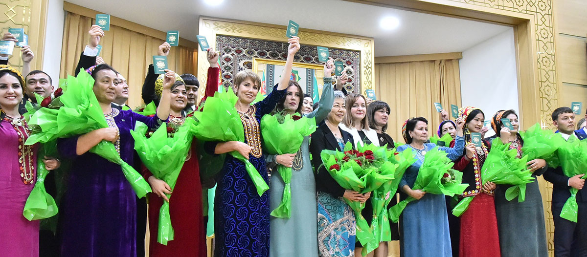 Şu gün Döwlet migrasiýa gullugynyň maslahatlar zalynda Türkmenistanyň raýatlygyna kabul edilen adamlara pasportlary gowşurmak dabarasy boldy. Hormatly Prezidentimiz Gurbanguly Berdimuhamedow 20-nji sentýabrda geçirilen Ministrler Kabinetiniň mejlisinde Türkmenistanyň raýatlygyna 863 adamy kabul etmek hakynda Permana gol çekdi. Şu dabara ýurdumyzyň ministrlikleriniň we pudaklaýyn dolandyryş edaralarynyň, Türkmenistanda işleýän halkara guramalarynyň hem-de köpçülikleýin habar beriş serişdeleriniň wekilleri, ýaşulular gatnaşdylar. Dabara gatnaşyjylaryň çykyşlarynda apatridleriň meselelerini çözmäge berýän uly ünsi, olaryň abadan durmuşy üçin hemme şertleriň döredilýändigi üçin döwlet Baştutanymyza tüýs ýürekden hoşallyk bildirildi. Dabarada BMG-niň Bosgunlaryň işi baradaky Ýokary Komissarynyň müdiriýetiniň Merkezi Aziýa boýunça sebit edarasynyň baştutany Ýasuko Oda, BMG-niň Baş sekretarynyň Merkezi Aziýa boýunça ýörite wekili, BMG-niň Merkezi Aziýada Öňüni alyş diplomatiýasy boýunça sebit merkeziniň baştutany Natalýa German, BMG-niň Türkmenistandaky hemişelik utgaşdyryjysy Ýelena Panowa raýatsyzlyk meseleleriniň çözülmeginde Türkmenistanyň saldamly goşandyny bellediler. Ýurdumyzyň görkezýän nusgasy diňe bir Merkezi Aziýa sebiti üçin däl, eýsem, bütin dünýä üçin hem möhümdir. Hut şular barada şu gün hormatly Prezidentimiz Gurbanguly Berdimuhamedowyň adyna BMG-niň Bosgunlaryň işi baradaky Ýokary Komissary Filippo Grandiden gelip gowşan hatda hem nygtaldy. Ol öz hatynda Merkezi Aziýada we dünýä derejesinde raýatsyzlyk meselesiniň çözülmeginde öňdäki orny eýelemegi dowam edýän Türkmenistanyň alyp barýan işi üçin hoşallygyny beýan etdi. Ynsanperwer ugur Türkmenistanyň içeri we daşary syýasatynyň düzüm bölekleriniň biridir. Ýurdumyz sebitde ilkinjileriň hatarynda bu meselä örän uly üns berip başlady. Bosgunlar we raýatlygy bolmadyk adamlar baradaky meseleleriň çözülmegine halkara tagallalarynyň birleşdirilmegi talap edilýär. Garaşsyzlyk ýyllarynda 23 müňe golaý (22 müň 930) adam Türkmenistanyň raýatlygyna kabul edildi. Hormatly Prezidentimiziň başlangyjy bilen raýatlygy bolmadyk adamlara goldaw bermek we bu ýagdaýyň öňüni almaga degişli kepillikleri üpjün etmek üçin 2018 — 2024-nji ýyllarda raýatsyzlygy ýok etmek boýunça hereketleriň milli meýilnamasy işlenip taýýarlanyldy. Mahlasy, bu waka ýurdumyzyň halkara hukugynyň umumy kabul edilen kadalaryna, döwlet Baştutanymyz Gurbanguly Berdimuhamedow tarapyndan öňe sürülýän sebit we dünýä derejeli ynsanperwer başlangyçlary ösdürmäge hemişe ygrarlydygyny ýene-de bir gezek tassyklady.