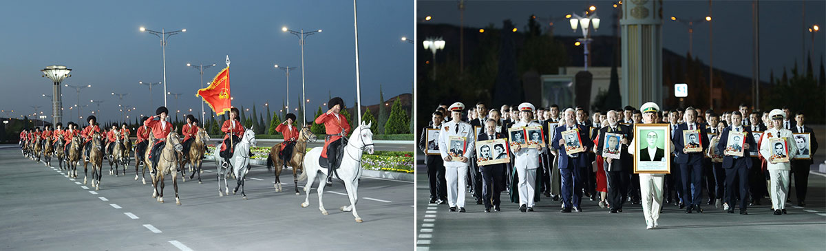 Şu gün hormatly Prezidentimiz Gurbanguly Berdimuhamedow 1941 — 1945-nji ýyllaryň Beýik Watançylyk urşunda gazanylan Ýeňşiň 75 ýyllygy mynasybetli guralan dabaralara gatnaşdy. Näçe ýyl geçse-de, Watan goragyna aýaga galan gahrymanlaryň edermenligi minnetdar nesilleriň hakydasynda we ýüreklerinde hemişelik saklanýar. Olar şöhratly Watan goragçylarynyň batyrlygynyň we gaýduwsyzlygynyň öňünde baş egýärler. Hut şonuň üçin hem weteranlaryň ordenleriniň, medallarynyň jaňňyrdysyndan döreýän owaza beslenen bu ýaz güni şol bir wagtyň özünde hem gussaly, hem nurana. Gazaply uruş ýyllarynda türkmen halkynyň müňlerçe edermen ogullary doganlyk halklaryň wekilleri bilen egin-egne berip, söweş meýdanlarynda gaýduwsyzlyk görkezdiler hem-de hakyky edermenligiň, durnuklylygyň, şöhratyň we namysyň beýik nusgasyna öwrüldiler. Olaryň hatarynda hormatly Prezidentimiz Gurbanguly Berdimuhamedowyň atasy Berdimuhamet Annaýewiň bardygyny, onuň durmuş ýolunyň täze taryhy eýýamda ösüp barýan ýaş nesiller üçin watansöýüjiligiň, borja wepalylygyň nusgalyk mekdebine öwrülendigini bellemeli. Bu günki baýramçylyk dabaralary möhüm waka — Aşgabat şäheriniň Halkara howa menziline gymmatly mukaddesligi alyp gelen uçaryň gelip gonmagy bilen alamatlandy. Uçaryň bortunda edermen we gaýduwsyz esger Berdimuhamet Annaýewiň söweşen 206-njy atyjylyk diwiziýasynyň 748-nji atyjylyk polkunyň söweşjeň baýdagy bar. Uçaryň ýanynda Türkmenistanyň Ýaragly Güýçleriniň Hormat garawulynyň esgerleri nyzama düzüldi. Russiýa Federasiýasynyň Ýaragly Güýçleriniň Hormat garawulynyň serkerdesi iki esgeriň ugratmagynda söweşjeň baýdagy uçardan çykarýar we ony Russiýanyň biziň ýurdumyzdaky ilçihanasynyň harby gullukçysyna gowşurdy. Soňra gymmatly mukaddesligi getirýän awtoulag kerweni «Halk hakydasy» ýadygärlikler toplumyna tarap ugraýar. Döwlet Baştutanymyz Gurbanguly Berdimuhamedow şanly sene mynasybetli türkmen halkyna iberen Gutlagynda weteranlara Watanymyzyň öňünde bitiren hyzmatlary üçin minnetdarlyk bildirip, merdana watandaşlarymyzyň aldym-berdimli söweşlerdäki gahrymançylygynyň hem-de gaýduwsyzlygynyň häzirki we geljekki nesilleriň ýüreklerinde baky ýaşajakdygyny belledi. Gutlag hatynda nygtalyşy ýaly, doganlyk halklar bilen birlikde, urşuň agyr synaglaryny başdan geçiren watandaşlarymyzyň müňlerçesi dünýäde parahatçylygyň we azatlygyň hatyrasyna söweş meýdanlarynda edermenligiň, gaýduwsyzlygyň, hakyky watançylygyň hem-de belent adamkärçiligiň deňsiz-taýsyz nusgasyny görkezdiler. Milli Gahrymanlaryny hatyralamak türkmen halkynyň gadymdan gelýän asylly däpleriniň biri bolup durýar. Mähriban halkymyzyň parahatçylygynyň, bagtyýarlygynyň we abadançylygynyň hatyrasyna baş goýan gaýduwsyz pederlerimiz, 1948-nji ýylyň weýrançylykly Aşgabat ýertitremesi hakyndaky ýatlama paýtagtymyzdaky «Halk hakydasy» ýadygärlikler toplumynda öz beýanyny tapdy. Onuň düzümine «Baky şöhrat» we «Milletiň ogullary» ýaly 1941 — 1945-nji ýyllaryň urşunda söweş meýdanlarynda baş goýan Watan goragçylarynyň ýadygärlikleri, şeýle hem «Ruhy tagzym» ýadygärligi bar. Her ýylyň 9-njy maýynda aşgabatlylar hem-de paýtagtymyzyň myhmanlary, dürli ýaşdaky adamlar we milletleriň wekilleri ýürek çagyryşy hem-de kalbyň erki bilen bu ýere gelip, adamzat taryhynda iň gandöküşikli söweş bolan Beýik Watançylyk urşundan gaýdyp gelmedik watandaşlarymyzy hatyralaýarlar. Jandan geçip, dürli pidalary we heläkçilik çekip gazanylan parahatçylykly durmuş üçin minnetdarlyk duýgusyna beslenen adamlaryň yzy üzülmeýär. Olar ýadygärligiň etegine gül desselerini goýmak maksady bilen, öçmejek halk hakydasyny äşgär edýän «Baky oduň» ýerleşýän ýerindäki binalar toplumyna gelýärler. Uruş ýyllarynda her bir türkmen maşgalasy öwezini dolup bolmajak ýitgä sezewar boldy. Söweş meýdanlarynda wepat bolan we Ýeňiş bilen öýlerine dolanan türkmen esgerleriniň hemmesiniň atlary «Hatyra» we «Şöhrat» atly köp jiltli neşirlere girizildi. Olarda biziň watandaşlarymyzyň Beýik Watançylyk urşy ýyllarynda görkezen söweşjeň edermenligi baradaky maglumatlar jemlendi. Şu gün baýramçylyk dabaralarynyň geçýän ýerinde özboluşly ruhubelentlik emele geldi. Ýaz ýagşy bilen ýuwlan baglar, gök zolaklar, dürli güller ýadygärlik toplumyna getirilýän gül çemenleri, ak saçly weteranlaryň döşündäki ordenleriň, medallaryň öwüşgini bilen bir bitewi sazlaşygy döredýär... Uzakda galan 1945-nji ýylyň Ýeňiş dabarasyna gatnaşan we Ikinji jahan urşunda biziň bagtyýarlygymyz hem-de abadançylygymyz ugrunda söweşen esgerleriň hatary ýyl-ýyldan azalýar. Ýöne häzirki döwürde biziň aramyzda gezip ýören aksakgal ýaşulular özleriniň uly ýaşyna garamazdan, edil ozalkylary ýaly hatarda bolup, ýurdumyzyň gündelik durmuşyna, ýaş nesilleriň watansöýüjilik we Watana wepalylyk ruhunda terbiýelenmegine işjeň gatnaşýarlar. «Halk hakydasy» ýadygärlikler toplumyna gül goýmak dabarasyna Türkmenistanyň Prezidenti, ýurdumyzyň Ýaragly Güýçleriniň Belent Serkerdebaşysy goşun generaly Gurbanguly Berdimuhamedow gatnaşdy. Türkmen halkynyň söweşjeň däplerini, şöhratly pederlerimiziň watansöýüjilik ýörelgelerini dowam etdirijiler bolan Hormat garawulynyň esgerleri nyzama düzüldiler. Söweşjeň şöhratyň we umumymilli hakydanyň mukaddes künjegi bolan beýik binalaryň üçüsiniň etegine hormatly Prezidentimiz ajaýyp gül desselerini goýýar. Döwlet Baştutanymyzyň yz ýany bilen Mejlisiň Başlygy, Ministrler Kabinetiniň Başlygynyň orunbasarlary hem-de harby we hukuk goraýjy edaralaryň ýolbaşçylary gül goýýarlar. Olaryň yzysüre jemgyýetçilik guram