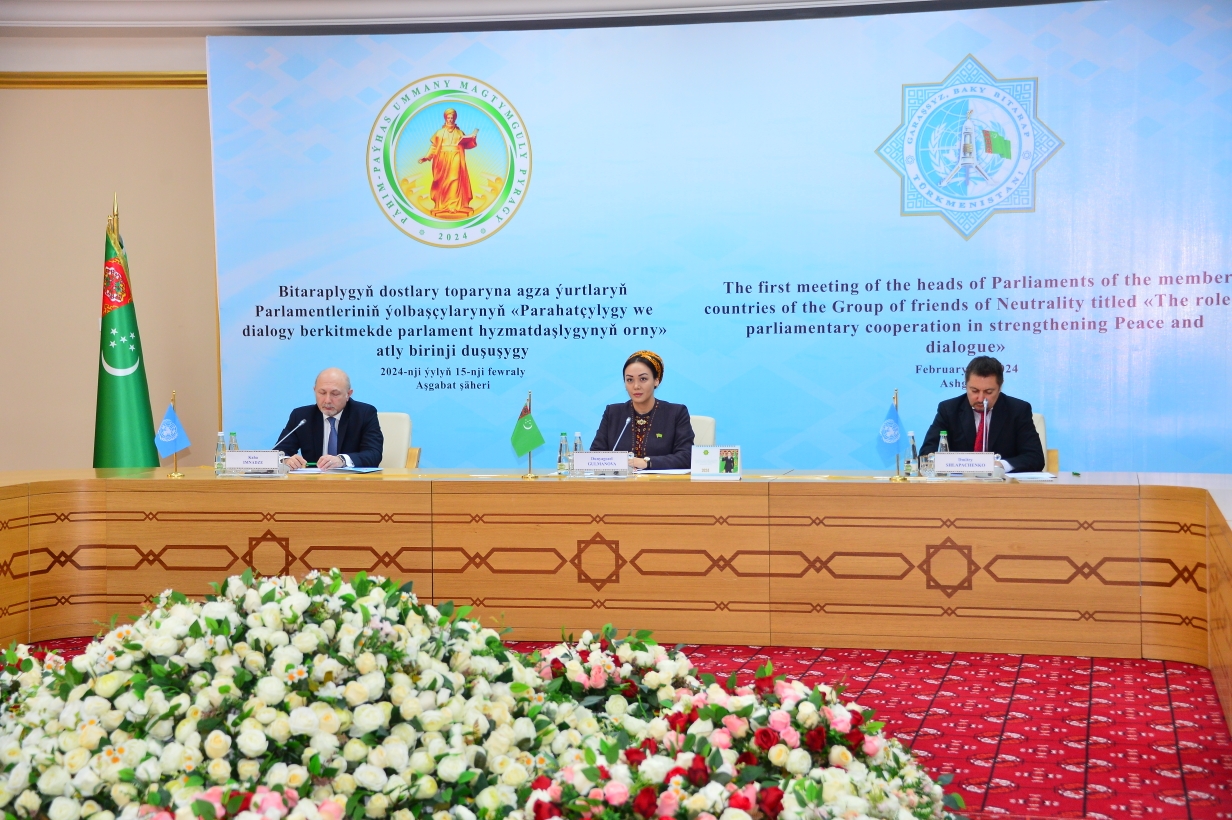 2023-nji ýylyň 11-nji dekabrynda paýtagtymyzda utgaşykly görnüşde parahatçylygyň, howpsuzlygyň we durnukly ösüşiň bähbidine Bitaraplygyň dostlary toparynyň ýokary derejedäki mejlisi geçirilipdi. Onuň dowamynda halkara hyzmatdaşlygy ilerletmekde, ählumumy parahatçylygy, howpsuzlygy pugtalandyrmagyň gurallaryny işjeň ulanmakda ýurdumyzyň eýeleýän ornuna ýokary baha berildi. Parlamentarileriň şu gezekki köptaraplaýyn duşuşygy hem bu maksatlara ýetmäge gönükdirilendir. Oňa dünýäniň dürli ýurtlaryndan parlamentleriň, halkara we sebit guramalarynyň ýolbaşçylarydyr wekilleri gatnaşdylar.