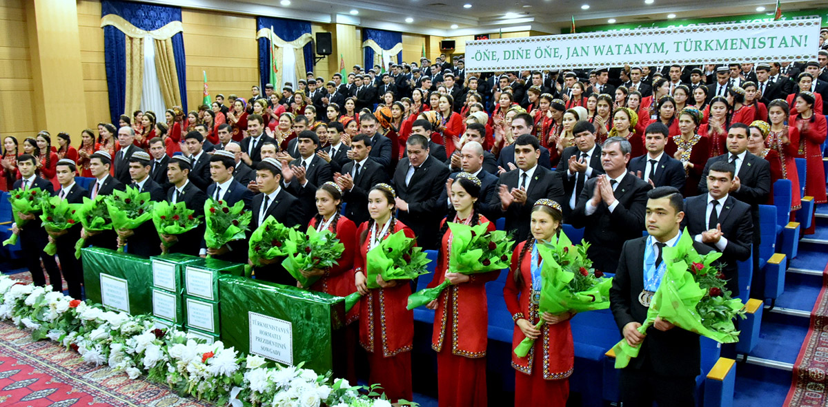 In the conference hall of the capital National Institute of Sports and Tourism the ceremony in honour of prize-winners of international tournaments which passed in early December, took place. On behalf of President Gurbanguly Berdimuhamedov the sportsmen who gained successful results on the world arena, special gifts were handed. Representatives of some profile departments of the State Committee for Sports, the Ministry of Foreign Affairs, sports high school, including its students, teachers, and also trainers took part in the solemn action. The gathered warmly congratulated athletes on the high awards won at prestigious competitions. As was underlined, their achievements - the evidence of success of the policy of President Gurbanguly Berdimuhamedov in sports. Among the awarded - winners of three large international tournaments: the world championship in weightlifting (Anaheim, USA), the world championship in kurash (Istanbul, Turkey) and VII International games of martial arts (Minsk, Belarus). (Jerk, push, combined) in the weight category under 77 kg three silver awards were won by the champion of the 5th Asian indoor and martial arts games Rejepbay Rejepov. Christina Shermetova in the weight category under 53 kg won ""silver"" in the combined event and two ""bronze"" in jerk and push events. It is necessary to notice that the awards won by Christina, became the first for all time of participation of the female weightlifters of the national team in the world championships. In the world kurash championship in Turkey our fighters won at once nine medals. Today winners of ""silver"" - Dayancha Omirov, Shamuhammet Kurbanov and bronze prize-winners - Marat Orazov, Erkin Omurzakov, Begench Baltaev, Hudayberdi Jumaev, Zarina Saparova, Mehriban Kurbanova, Gulshat Nasyrova. Warm words and congratulations also were addressed to the Turkmen athletes who have ascended the podium of VII International games of martial arts, held in the capital of Belarus. They are winner of games Goshanyaz Durdyev and bronze prize-winners - Mahri Agaeva, Orazmyrat Charyev and Gaygysyz Atabaev. In the given tournament sportsmen have won all medals in taekwondo (ITF).