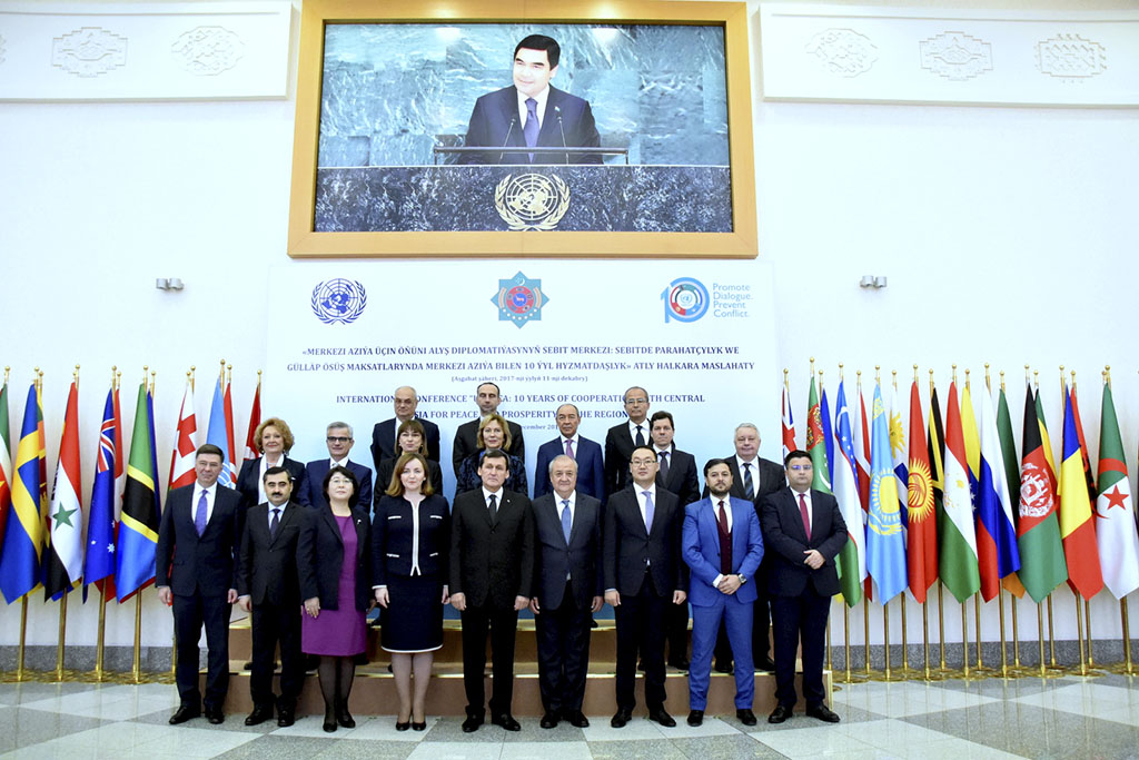 Heads and representatives of national diplomatic corps, foreign departments of Central Asian countries – the Republic of Kazakhstan, Kyrgyz Republic, the Republic of Tajikistan, the Republic of Uzbekistan as well as the Islamic Republic of Afghanistan and number of other countries took part in the forum held at the Ministry of Foreign Affairs. Special Representative of the United Nations Secretary General, the Head of the UN Regional Centre for Preventive Diplomacy for Central Asia, the Executive Secretary of the UN European Economic Commission, the UN Permanent Coordinator, the UNDP Permanent Representative in Turkmenistan, the Head of the OSCE in Ashgabat were among the participants. The representatives of the UN Mission of Support of Afghanistan and other international organizations including the SCO and the CIS, diplomatic missions accredited in or country as well as mass media took part in the Conference. Opening the Conference, the representative of Turkmenistan conveyed warm greetings and wishes of successful work to the participants for President Gurbanguly Berdimuhamedov. It was mentioned that such representative composition of the participants of the forum is the indicator of keen interest, recognition and support of the UNRCCA activity by the countries of the region and entire world community and the evidence of high authority that was gained by professional and productive work on the achievement of set targets and objectives. The work of the Centre is not limited by political range of problems but also covers the issues of sustainable development, protection of the environment, support of educational programmes and projects, humanitarian dialog and others. Turkmenistan welcomes the expansion of the range of the UNRCCA work, considering it as an important input to the achievement of strategic goal – the establishment of solid system of peace, stability and security in Central Asia. After, the floor was given to Special Representative of the UN Secretary General, Head of the UN Regional Centre for Preventive Diplomacy for Central Asia Natalia Gherman. Addressing the participants, the Head of the Centre cordially congratulated the members on the 10th anniversary of the UNRCCA on behalf of the United Nations Secretary General Antonio Guterres, having also highlighted that current celebration falls on International Neutrality Day that would be observed by the world community on December 12. In her speech, Mrs Gherman expressed sincere gratitude to President of Turkmenistan Gurbanguly Berdimuhamedov for his personal enthusiasm and permanent support of the activity of the Centre, for high level of organization of the activities timed to this remarkable date. It was noted that for the past 10 years, the UNRCCA acquired big potential making considerable input to the support of peace and stability in the region, what has been done by application of the tools of preventive diplomacy, which necessity is on high demand today. The efforts of the Centre are aimed at the development of fruitful cooperation between Central Asia countries, support of their foreign initiatives oriented at he establishment of good relations. It was also highlighted that the leaders of the United Nations pay great attention to this region. Thus, in 2017, the UN Secretary General has visited all five Central Asia countries including Turkmenistan. In this regard, Mrs Gherman has focused on the High-level Dialog between the UN and Central Asia on Realization of the UN Global Counterterrorism Strategy meeting held in Turkmen capital in June of this year. The trust and constructive cooperation are the most important things in preventive diplomacy. Speaking of this, the Head of the UNRCCA expressed deep gratitude to Turkmenistan for the initiation of the Resolution on the occasion of the 10th anniversary of the Centre as well as to all Central Asian states who were the co-authors of this Resolution. This is important for the whole region as it reflects the priorities of our partnership for security and prosperity of Central Asia, Mrs Gherman highlighted, having assured that the UNRCCA would continue working actively in this direction. Special video about the activity of the UN Regional Centre for Preventive Diplomacy for Central Asia was demonstrated to the participants of the forum. The conference continued its work in the format of plenary sessions “Promotion of Dialog, Prevention of Conflicts: Best Practices, Lessons and Look to the Future” and “Preventive Diplomacy in Action: World Practice, Cooperation of the UN Regional Organizations and Structures”. It was mentioned in the speeches that the last years proved the importance of permanent neutral status of Turkmenistan as efficient mechanism for the consolidation of regional global peace and security, provision of sustainable development and correspondence to ideals and goals of the United Nations Organizations. Demonstrating new integrated approaches to the solution of topical issues of the present, pur country invariably stands out from the positions of wide international cooperation for the interests of universal prosperity and progress. this fact defined the selection of Turkmen capital as the Headquarter of the UN Regional Centre for Preventive Diplomacy for Central Asia, which was unanimously supported by all states of the region. Head of Turkmen State Gurbanguly Berdimuhamedov took personal part in the ceremonial opening of the UNRCCA, the structures with no analogue within the UN, in Ashgabat on December 10, 2017. The President of Turkmenistan initiated the foundation of this structure, having given the start of the process of the formation of new model of cooperation in one of the strategic region of the planet. The implementation of this conceptual idea was supported with the understanding of the relevance and necessity of such Centre by the UN and regional community, first, by Central Asia states. Thus, the permanently operating working agenc
