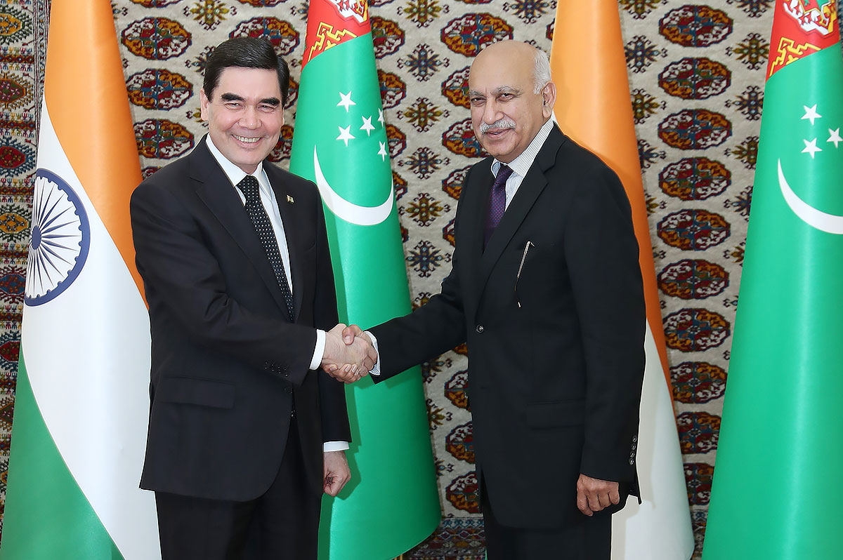 President Gurbanguly Berdimuhamedov met with the State Minister of Foreign Affairs of the Republic of India Mobashar Javed Akbar who arrived in Turkmenistan as a head of representative delegation of his country for the participation in coming ceremonies. Having expressed the gratitude for warm and cordial welcome, high ranking guest conveyed the greetings and best wishes of the leaders of the Republic of India to the Head of the State and to all Turkmen people. Having addressed return greetings to the highest officials of friendly state, the President of Turkmenistan highlighted that our nations are connected by historical, spiritual and cultural roots that go far to the centuries. India has always been and remains to be important partner of our country, to cooperation with which special attention is paid. Share of the opinions on priority subjects of interstate cooperation took place during the conversation. In this context, the role of high-level meetings in the development of traditional friendly relations between the countries as well as in the issues of political and diplomatic collaboration including under international organizations has been mentioned. Trade and economic sphere, transport and communication, health protection, high technologies, textile industry and number of other spheres have been mentioned among topical directions of the partnership. In this regard, the importance of Interstate Turkmen – Indian Commission of trade, economic, scientific and technology cooperation has been highlighted. In addition, the necessity of continuation of the practice of bilateral meetings on different levels, which allows defining priority vectors of cooperation that is built on equality and mutual benefits, has been mentioned. Perspectives of the cooperation in fuel and energy sector, where special place is allocated to the realization of the project of construction of Turkmenistan – Afghanistan – Pakistan – India gas pipeline, were separate subject of discussion. Building of transnational gas main is economically beneficial for all participants of this project, President Gurbanguly Berdimuhamedov said, having highlighted that TAPI is to make considerable contribution to stable social and economic development of the states in Asian region and generally to support the consolidation of global energy security. Mabashar Javed Akbar highlighted keen interest of his country in the supplies of Turkmen natural gas what was conditioned by growing requirements of intensively developing Indian economy in energy carriers. Having noted that implementation of TAPI project would support the consolidation of Turkmen – Indian cooperation that is built on the principles of constructive partnership and long terms, Turkmen leader and his guest confirmed mutual intent to accelerate the realization of this project and the willingness to take all necessary measures for these purposes. Having touched upon the subject of the partnership in transport and communication sphere, the State Minister of Foreign Affairs of the Republic of India highlighted the importance of the projects of construction of railway corridors initiated by our country, particularly Serhetabat – Turgundy railroad that is planned to be opened as well as the launch of construction of international power and fibre optic lines that bring the progress to entire region. In addition, the role of traditional cultural and humanitarian contacts in the consolidation of friendly and trustful relations of both nations has been highlighted.