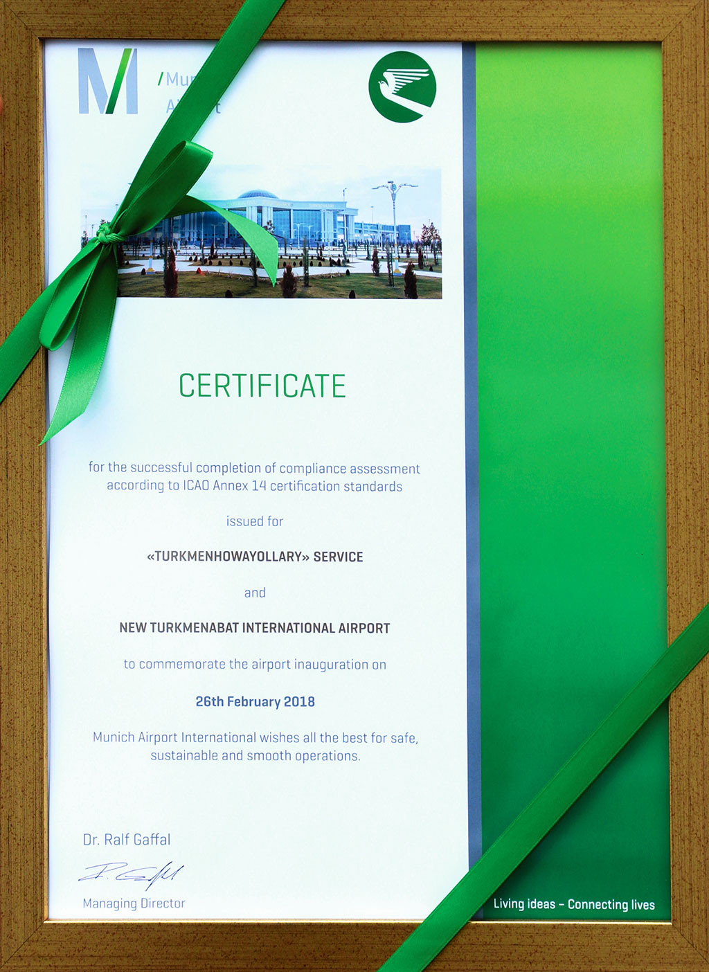International Airport was opened with the participation of President Gurbanguly Berdimuhamedov Turkmenabat, the administration centre of Lebap Velayat. New airport is designed not only to satisfy growing needs of the eastern region in air traffic but also to highlight the status of the city on Amudarya River that currently turns into big industrial cluster of Turkmenistan. The Chairperson of the Mejlis, Deputy Chairmen of the Cabinet of Ministers, leaders of military and law enforcement agencies, representatives of non-governmental organizations, foreign and national mass media, ambassadors of foreign states to Turkmenistan, hyakims of the velayats and Ashgabat as well as local residents took part in the ceremony. The Head of the State cut symbolical ribbon and addressed the participants with greeting speech. Having characterized the development rates of the country and specify briefly future plans, the President of Turkmenistan highlighted that this large-scale activity is aimed at the improvement of life level of people and entails the expansion of the cooperation with different countries in the world, especially with neighbouring countries in the region. In this context, the importance of the launch of construction of Afghan part of TAPI pipeline three days ago was highlighted. The importance of work for the formation of modern transport and logistic infrastructure in the country has been also emphasized. The construction of the airport in Turkmenabat was another step in this way. This International Airport will be one of the most important intersections of transport communications that are to serve to the consolidation of friendship and peace between the states. After. Foreign guests made speeches. In particular, representative of the Guinness World Record Book noted high technological effectiveness of new airport in Turkmenabat, having highlighted that air view of passenger terminal in the shape of star deserves special attention. Such excellent architectural solution is unique feature of the airport that has no analogues in the world. We consider it deserves to occupy an honoured place in the Guinness Record Book, the guest said, having presented the Certificate of the Guinness World Record Book officially certifying the uniqueness of architectural design of passenger terminal of Turkmenabat Airport to Chairman of Turkmenhowayollary Service D. Saburov. New airport is ready to work and would deservingly carry out its mission, the representative of Munich International Airport, which specialists were chosen as the consultants and experts to evaluate the operation of all systems of Turkmenabat International Airport, said in his turn. The certificate proving this fact has also been presented to D. Saburov. New airport was built by “Gundogdy” Individual Enterprise, the Member of the Union of Industrialists and Entrepreneurs of. The facilities of new airport stretched on the area of 600 hectares. Passenger terminal building occupies 37 thousand square meters. Maximally comfort conditions for waiting, check-in and boarding of the passengers have been made in the terminal. Information display, international and intercity communication centre, luggage storages, cafeterias, bars, shopping outlets are to the disposal of the passengers. There are CIP lounge, duty free stores, internet cafes and other services. After the opening ceremony, Turkmen and foreign airlines flight have landed in new airport. 3800 meters long and 60 meters wide runway is equipped with ground flight support systems like landing systems, distance-measuring radio beacon, runway lighting and meteorology equipment that allows receiving all types of aircrafts. The airport is provided by the world known companies producing specialized equipment. Centralized fuelling system allows fast and quality service of the aircrafts. The airport has medical centre, canteen, hotel for 100 guests, covered parking. It also has all life support systems, engineering and transport communications.