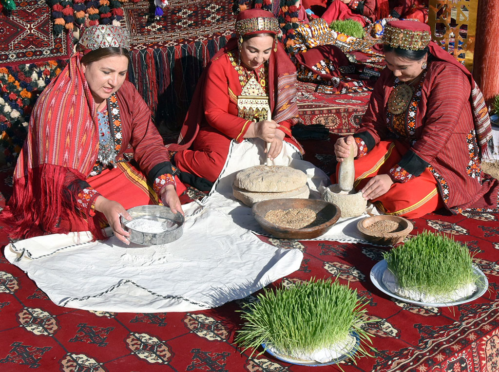 National Spring Holiday - International Nowruz Day was celebrated with great effect in Turkmenistan. The main events of the celebration were expanded on tradition place «Nowruz ýaýlasy» where the building in the shape of huge traditional tent «Türkmeniň ak öýi» has been built. This place keeps the layers of ancient civilizations. It is Ahal foothills where the farmers started to cultivate the wheat for the first time. The legendary ahalteke horses were also originated from this place. In the morning, the guests and participants of the celebration on occasion of spring arrival and nature awakening, which symbolize the peace and harmony among people, good neighbourhood and friendship, went to this place. This year, which is held under the slogan “Turkmenistan is the Heart of the Great Silk Road”, the Nowruz Holiday connected two epochs – the one that gave birth and life to the legendary ancient life artery of huge continent that became the symbol of progress and cooperation and our time when this historical route is restored in new format. Important international initiatives of President Gurbanguly Berdimuhamedov that are highly appreciated by the world community owing to practical measures taken by Turkmenistan for their implementation in the region are aimed for this purpose. The President of the country arrived there by helicopter and afterwards, went together with the members of the Government, leaders of the Mejlis, ministries and departments of the country, non-governmental organizations, diplomatic corps accredited in Turkmenistan to «Nowruz ýaýlasy» place. President Gurbanguly Berdimuhamedov and the guests were greeted by the columns of school and university students with flags and balloons, honoured elders, residents of Ahal velayat and the capital, participants of the event from all the places of our homeland lined up along road. There were representatives of Afghanistan, Tatarstan of the Russian Federation, Uzbekistan, Kyrgyzstan, Turkey, Kazakhstan, Tajikistan and Iran. Traditionally, the group of tourists from United States of America, Australia, Great Britain, France, Norway, Singapore and other countries, which number grows in the spring, arrived to the place of the celebration. This is a unique opportunity to see the whole picture of original traditions, starting from work and artistic to cooking, to dive into inexpressible atmosphere of the celebration and to touch not only the museum history but also the living soul of the nation. International observers from the Organization for Security and Cooperation in Europe, the Commonwealth of Independent States, Shanghai Cooperation Organization and other who arrived in our country to monitor coming elections of the Mejlis deputies, members of the People’s councils and Gengeshys were also the guests of the celebration. Wonderful city from oriental fairy tale outstretched its properties across the place. Spacious meadow became the huge stage for the celebration and Turkmen settlements with all particular attributes, busy trade cities, which were scattered along the Silk Road that used to run across our country, were the decorations of the place. The girls welcomed with traditional bread and salt, treats and sweets inviting everybody to take part in bright celebration, which started from the tree planting ceremony… Having warmly greeted the participants, President Gurbanguly Berdimuhamedov went to the place prepared for tree plantation. The President planted young mulberry tree, having started mass greening action. Representative of practically all branches of national economy as well as diplomatic corps accredited in Turkmenistan and foreign guests of our country took part in the event. After, President Gurbanguly Berdimuhamedov and the guests of the celebration went to the entrance of original historical gallery, which is made in the shape of book of the President “Turkmenistan is the Heart of the great Silk Road”. The book was opening and its front page with the map of ancient trade routes turned into the arch inviting everybody to make a trip along this exciting narration filled with wonderful legends and stories taken as the basis of this grandiose celebration performance. Journey on the cities of Turkmen land that have left a bright track in the chronicles of our nation and its cultural heritage, was starting. Lebap was the first to welcome the guests. In the ancient times, Amul was the place where the Jeytun used to carry its waters, which banks preserved many evidences of the past like Dayahatyn caravansary. Demonstration of the tools was on the right hand side of the path and anyone could watch the work of the masters, which skills used to make magnificent and beautiful works of decorative and applied art and architectural masterpieces. Astanababa Mausoleum is one of such monuments, to which the flow of pilgrims never stops. next to the decorations imitating architectural look of this memorial complex, the artists of S. Seydi Lebap Theatre performed the stage play of the plot of the legend about the ruler and dervish from the book of the President of Turkmenistan. After, the exhibition of handcrafts made in traditional for Amudarya region style was expanded along the way. It also showed the process of making of home textile, lint-free carpets (kilim) and patchwork technology. The next monument that met the guests of celebration was the Alamberdar Mausoleum representing the sample of XI century architecture. Decoration construction on «Nowruz ýaýlasy» reflected in details the decoration of facades with ornamental brickworks and arched niches. At this place, united dance band performed folk composition reflecting of the legends from the book of President of Turkmenistan about forty girls. The legend says that in old times, forty beautiful girls used to live in the mountain village next to the gorge. They used to come to cool cave every day where took rest and swam. Once, the village was raided