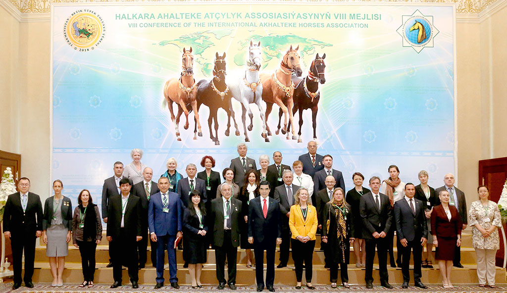 VIII session of International Ahalteke Equestrian Association was held in Ashgabat chaired by President Gurbanguly Berdimuhamedov. For all the years, International Ahalteke Equestrian Association with its headquarter in Ashgabat founded in 2010 has been an efficient ground for cooperation of the horse breeders from different countries specialized in breeding of thoroughbred ahalteke horses, improvement of this breed and development of its pedigree and sport features. Coordinated activity of the Association’s members allowed considerably expanding the work on popularization of ahalteke horses, which are national heritage of Turkmen people. Every year, the results of work of the Association and perspective plans of cooperation are reviewed at the sessions held before the Day of Turkmen Horse. Such regular meetings of specialists and connoisseurs of famous horses support the development of the main directions of the partnership, fill it with new content and enrich with new joint projects, actual ideas and business contacts. Decorated fashionable Oguzkent Hotel met the participants and guests of the forum. Members of the Government, foreign and local members of International Ahalteke Horse Association, personnel of equestrian industry of the country, representatives of mass media gathered there awaiting fir the Head of Turkmenistan. The vehicle of the President stopped at the square in from of the hotel. In the hall, the Head of the State was greeted by the participants of the session where photographing ceremony of delegates and guests of the forum with the President of Turkmenistan took place, after which everybody went to the conference hall of the hotel. Greeting the participants, President Gurbanguly Berdimuhamedov cordially congratulated everybody on the beginning of the forum, which is held for the eighth time in Turkmenistan – the birthplace of the world famous ahalteke horses. Having announced the agenda of the session, which is to be remarkable event of the year held under slogan “Turkmenistan is the Heart of the Great Silk Road”, the Head of the State noted that the subjects of further development of ahalteke horse breeding and equestrian sports on international level are to be reviewed, organizational issues of the organization on modern stage are to be discussed and relative decisions are to be take. For eight years since the foundation of International Ahalteke Equestrian Association, this structure was joined by number of ahalteke equestrian associations and private horse breeders from all over the planet. At present, the Association has 137 legal entities and individuals from 32 countries of the world and their number grows every year what reflects increasing scale of cooperation. President Gurbanguly Berdimuhamedov highlighted that colossal work is carried out for the development of the world glory of ahalteke horses – the models of beauty and grace, which was formed throughout the centuries in Turkmen land by national selection. This is visually indicated by the events organized on the Day of Turkmen Horse, which is annually widely observed in our country on the last Sunday of April. Solid foundation for protection and of the purity of the breed and increment of the livestock if ahalteke horses and their glory around the world has been laid owing to the establishment of International Ahalteke Equestrian Association. For the centuries, our ancestors paid special attention to the breeding of understanding like a human and loyal to the owner horses, which are being faster than the wind turned into superb model of beauty. Lot of efforts was put to the selection work, which is continued on deserving level by Turkmen horse breeders today, President Gurbanguly Berdimuhamedov said. For example, modern equestrian complex for breeding of 600 pedigree ahalteke horses was built in Aba Annayev village, Kyarizek Gengeshlyk, Gyoktepe etrap, Ahal Velayat. The complex also includes the living houses for personnel and other social facilities. The infrastructure of International Ahalteke and Ashgabat Equestrian Complexes was modernized. The race tracks of the facilities were covered with polymeric coating. In addition, training centre with indoor riding hall was opened on the territory of Ashgabat Equestrian Complex for further development of such equestrian sports as show jumping in the country and training of talented jockey in national equestrian games. International Horse Quarantine Centre for 120 horses was opened in Ak Bugday etrap, Ahal Velayat to provide the participation of Turkmen horses in the competitions abroad according to international rules as well as for medical test of the horses coming from other countries for the participation in competitions to our country and for necessary quarantine. National Equestrian Group Galkynysh makes deserving contribution to the world popularization of ahalteke horses and unique national art. Being in dozens of cities on tours and participating in international festivals, the group demonstrates exclusive features of our horses in sport and circus arenas. As an example, Turkmen leader mentioned the triumph of Galkynysh Group at International Circus Festivals in Russia, Italy, China where it was awarded with high prizes and sincere delight of the spectators and specialists. As is known, the programme of V Asian Indoor and Martial Arts Games in Ashgabat in September 2017 included the show jumping. It made new opportunities for deserving continuation of the glorious way of ahalteke horses in equestrian sports and for demonstration of outstanding abilities. Turkmen sportsmen successfully performed on ahalteke horses in these competitions and won the gold. Large-scale work is carried out in other directions of equestrian sports development. Relative specialists are trained in high and secondary professional institutes of our country. Titles “Honoured Horse Breeder of Turkmenistan” “ Master Jockey of Turkmenistan” and “People’s H