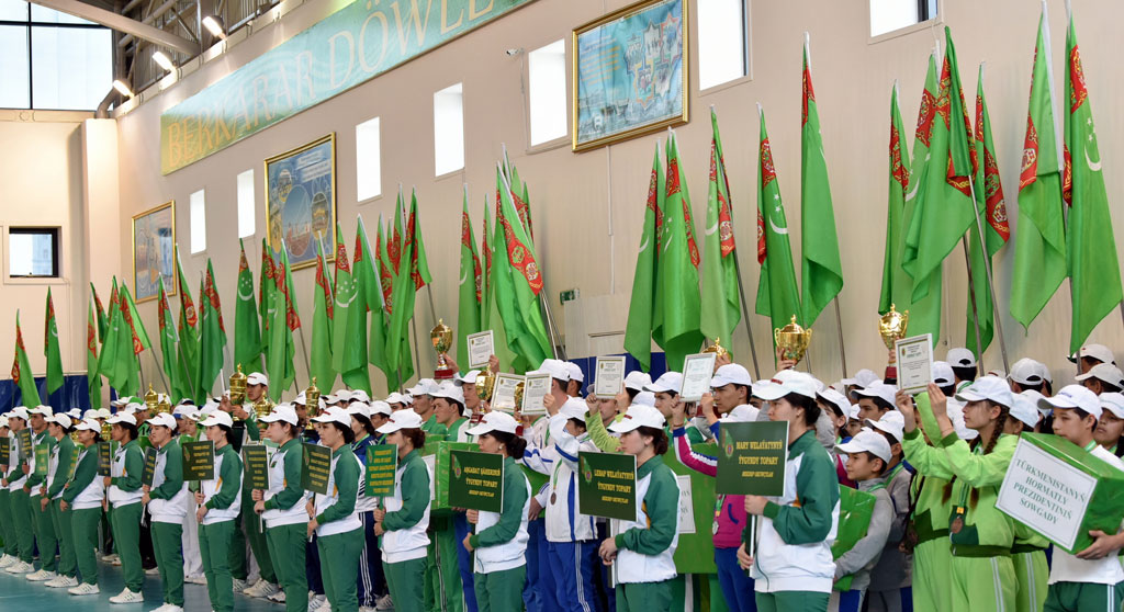 National Institute of Sport and Tourism hosted the award ceremony of annual event action “Turkmenistan – the Country of Health and Inspiration” that is aimed at wide popularization of mass sports. Ministry of Youth Affairs and Sports as well as the above-mentioned institute were the organizers of the event. During the whole month, the residents of the capital and regions participated in the different sport competitions defining the best on football, volleyball, basketball, track and field athletics, national wrestling and other disciplines. The participants who demonstrated high results received the awards and valuable gifts on behalf of the President of Turkmenistan. Sportsmen from the capital were the best among the teams of the country; personnel of the Ministry of Construction and Architecture were the best among the ministries and departments while the team of the Ministry of Interior was the best among law enforcement structure. The competitions between the students were also captivating. The team of National Institute of Sports and Tourism was the best among high education institutes; the team of Ashgabat secondary professional school of the Ministry of Construction and Architecture was the leader among the colleges; the team of capital school student were the best among secondary schools. During the event, students of sport school of Ashgabat Department of Youth Affairs and Sports demonstrated different sport performance. Captivating music and acrobatic performance was also showed by the students of National Institute of Sports and Tourism.