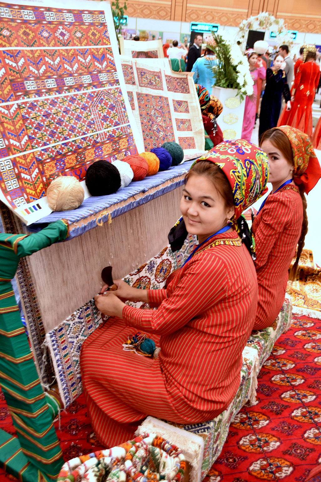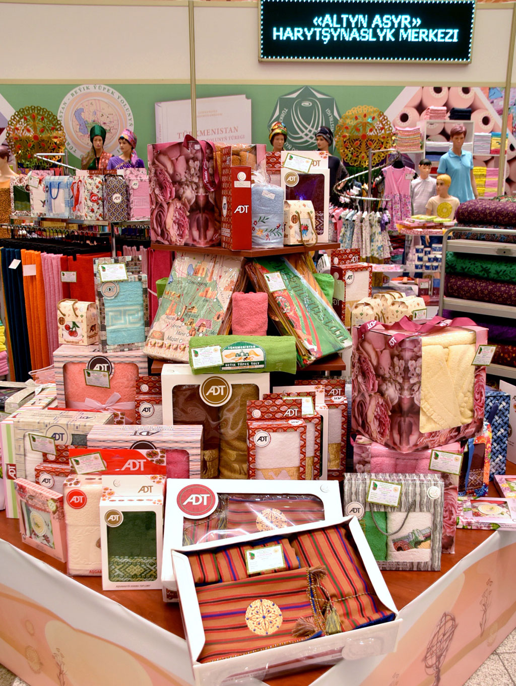 Various cultural meetings, artistic exhibitions and contests, music performance and sport competitions composed the celebration programme of the events dedicated to national heritage – Turkmen carpet. The glory of ancient handmade art have not been faded for the centuries the same way as the colours are not fading but turning into blossom on wonderful canvas delighting numerous connoisseurs all over the world. This year, which is held under slogan “Turkmenistan is the Heart of the Great Silk Road”, cultural events on occasion of professional holiday of carpet makers and textile workers are filled with special meaning. Unique artistic talent of our nation is opening to the world in wonderful carpet items and canvas, beautiful silk fabrics and embroidery that reached our days. Today, the largest museums of the planet have the samples of ancient carpets and dress made by the generations of Turkmen masters. The main events of the holiday were held in the capital. International Exhibition of Carpet and Textile Production of Turkmenistan and XVIII Conference of the World Turkmen Handmade Carpet Connoisseurs Association were timed to this event. These forums, which are to reflect considerable achievements and perspectives of the development of national light industry, became an excellent ground for the demonstration of modern technologies and innovations, fashion trends in the world textile industry, for attraction of beneficial and long-term cooperation with foreign colleagues in this sphere. Respectable composition of the delegations representing the companies from two dozens of the world countries proves the interest of business circles of the world in our country, their intent to consolidate their positions in attractive Turkmen market and for new companies to establish direct partnership. It includes the heads and specialists of big production facilities and trade companies, representatives of scientific and research and cultural centres as well as the scientists, experts, connoisseurs of Turkmen handmade carpet art from Russia, Germany, Switzerland, Belgium, China, Saudi Arabia, United Arab Emirates, India, Turkey, Singapore, Jordan, Pakistan, Afghanistan, Lithuania, Georgia, Kazakhstan, Armenia, Uzbekistan. Ceremonial opening of international economic review was held in the exposition Centre of the Trade and Industrial Chamber with the participation of the Head of the Parliament, members of the Government, ministries and departments, representatives of non-governmental organizations of the country, heads of diplomatic mission accredited in Turkmenistan, foreign businessmen, representatives of the press. Famous textile industry personnel and carpet makers, best personnel of various industries were among the honoured guests. The participants listened with the great attention to the greeting message of President Gurbanguly Berdimuhamedov addressed to the members and the guests of the forum. Impressive achievements of Turkmenistan as economical strong state taking stronger positions in the world especially in textile industry were comprehensively demonstrated by the exposition. Exhibition halls and stands presented all directions of the branch from production of certified cotton yarn and silk to readymade products meeting the tendencies of modern design and aesthetic. National use, bright colours and attributes of oriental bazar, atmosphere of cordiality and hospitality are distinguishing features of the exhibition. You can familiarize yourself with considerable potential of cotton-processing industry represented by spinning facilities and textile complexes of our country, which are the largest in Central Asia. The weaving based on innovative technologies, wide variety of weaving production including made of mixed cotton and artificial fibres made strong impulse to the development of sewing and knitting sector providing great profitability and competiveness of Turkmen goods in local and foreign markets. The stands of full of samples of yarn and fabrics like satin and staple as well as jeans items and knitted garments, man shirts, home textile. Bedding sets, bath towels and robes, kitchen cloths, terry items, socks and stockings products, medicinal wool and cosmetic wool pads in gift boxes attract the attention with bright decoration and colour gamma. Local textile with logo Made in Turkmenistan made of ecologically friendly natural cotton is important article in the export of our country, its national brand recognized all over the world today. Separate section of the exhibition is dedicated to silk industry. Silk weaving was always an original craft of our ancestors. One of the largest centres of the Silk Road Ancient merv was famous with its beautiful silk fabrics, which were very expensive and demanded on the markets of the East and West. Today, famous museums of the planet have samples of ancient Turkmen silk and dress as historical and artistic rarities. Special hall demonstrated entire intensive silk production process starting from the growing of mulberry trees, which leaves serve as a food for the silkworms, until the production of beautiful “ketene” fabrics of the silk thread. Today, the masters continuing the ancient traditions weave this fabrics by hands on horizontal machines called “tara”. This is the “keteni” fabrics that remains the most expensive one, from which our women make national and modern dress. It is also highly demanded in high-fashion world. Turkmen textile personnel was the first who arranged the production of popular panne. Designers and masters make dozens of varieties of this fabrics, which is very popular among the women all over the world. The silk is also required for production of beautiful silk carpets, which canvas are placed on the stands of current exhibition. Shoe-making and leather branches of textile industry is actively developed as well. Children and sport footwear from jeans as well as leather man’s shoes is advertised at the ex
