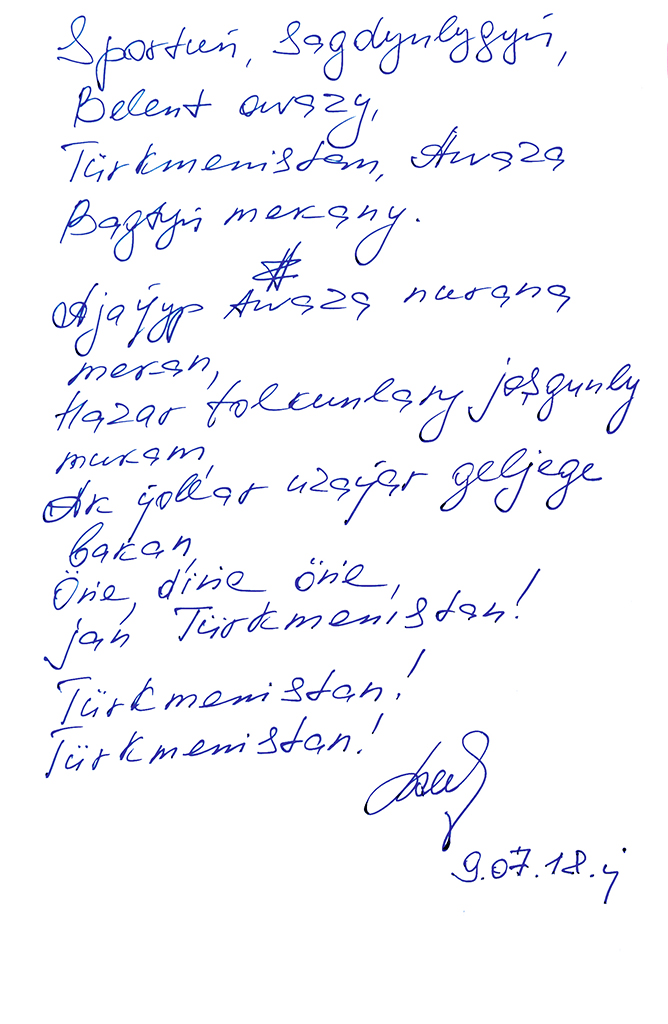 President Gurbanguly Berdimuhamedov, who is currently on his leave, dedicated his free time to the work on continuation of book “Turkmenistan – the Heart of the Great Silk Road” and doing some music art. Protection and study of historical and cultural monuments and intangible values, their broad popularization are the cornerstone of the state policy aimed at the improvement of intellectual potential of the society. Original heritage of our people is infinite treasure carefully passed from generation to generation, the Head of the State highlights. This is the theme, which is reflected in many works of President Gurbanguly Berdimuhamedov. Rich tangible and spiritual heritage of Turkmens and glorious past inspire artistic man for creation of new works, the President mentions. The Head of the State dedicated his day to the work on the book about the history, national culture and nature of the country. Fundamental work of President Gurbanguly Berdimuhamedov “Turkmenistan – the Heart of the Great Silk Road” written last year is dedicated to the past of the country, original traditions and rites, history of the cities founded along this transnational route. This work, which has been translated to dozens of foreign languages, became available for numerous foreign readers. Another work of the Head of the State based on different sources, especially on valuable historical information and documentary materials, which remained until our days, is the continuation of book “Turkmenistan – the Heart of the Great Silk Road”. Like all scientific and literature works of the President of the country, the book will sum up the data contained in historical and literature studies and manuscripts of different historical periods. Being the support of family values, the Head of the State spends his holiday with his grandchildren engaging them to various art directions. Kerimguly, who follows his grandfather in everything, dedicates all his free time to sport and music art. This day was not the exclusion. The boy continued working on the music to the poem «Sportly Türkmenistan, which President Gurbanguly Berdimuhamedov completed on the day before. Kerimguly has elaborated the composition taking into account the recommendations and wishes of the grandfather and asked the Head of the State to assess it. Having listened to new composition of his grandson, President Gurbanguly Berdimuhamedov noted that song have to reflect the spirit of time but at the same time, music traditions of the nations shall not be forgotten. During the conversation, Turkmen leader told about the richness and variety of music language. Composing the music, it is necessary to combine all these elements, the Head of the State said, having advised to elaborate the composition a little to make it perfect. The Head of the State noted that the art makes great influence on the development of spiritual world on the individual. Every composition based on national traditions has to be unique and remain through the centuries. Music works distinguished by originality and being exemplary gain wide popularity and love of people, reflects the ties of times and generations becoming integral part of national cultural heritage. Having finished working on music composition, President Gurbanguly Berdimuhamedov together with his grandson Kerimguly, who accompanied him on guitar, has sung new song песню «Sportly Türkmenistan» dedicated to coming International rally Amul – Hazar 2018, achievements of national sports and beauty of local nature in Turkmen and English languages.
