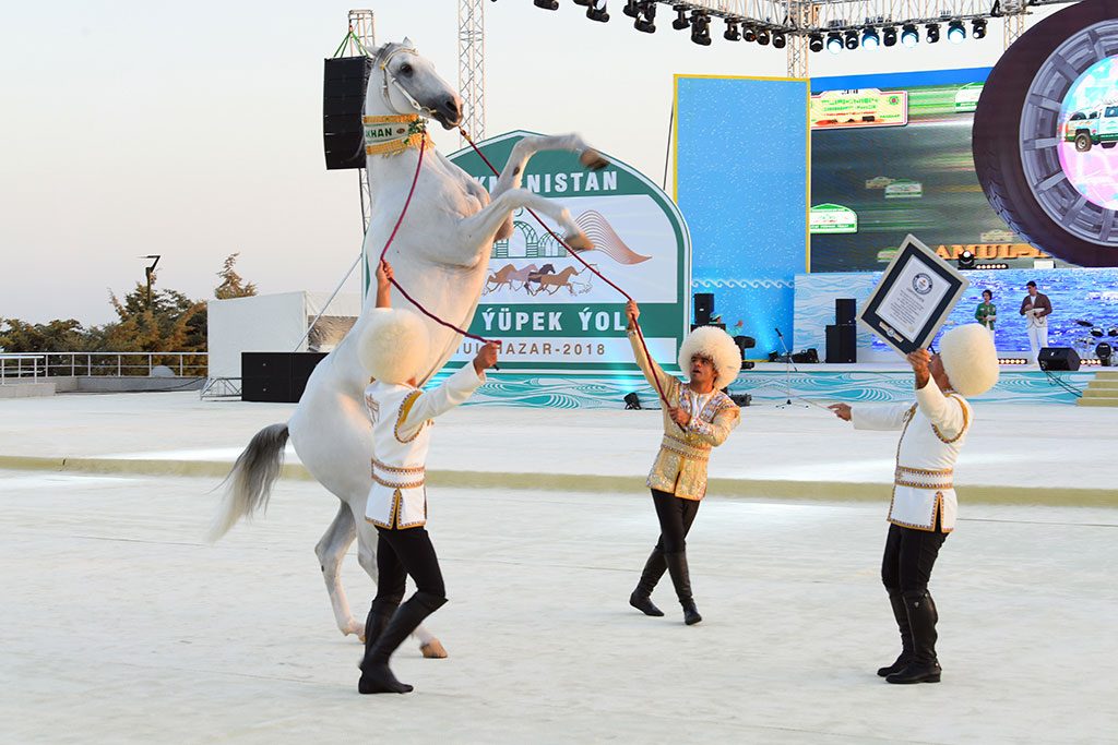In addition to the honouring of the winner of the race during bright events on Caspian coast on occasion of the closing ceremony of International rally Amul – Hazar 2018 initiated by President Gurbanguly Berdimuhamedov, another event, which would enter the history, took place. The Head of the State and all participants of the celebration were presented with the certificate of inclusion of horse Akhan from Ahalteke Equestrian Complex of the President of Turkmenistan to the Guinness Record Book. Unusual abilities of the horse has been officially registered – it managed to pace rearing 10 meters for 4.19 seconds rearing, having beaten previous record in this unique nomination by two times. . Besides the jury – the representatives of the world known publication, who has registered similar record in the past, numerous spectators of the celebration in Avaza were also able to see the absolute pattern of this record with their own eyes. Having bowed to the public with artistry and honour, Akhan easily reared and walked gracefully in vertical position for some distance. Delighted foreign guest literally jumped from their seats trying to capture this incredible performance with their gadgets. Exclamations of surprise and rapture sounded in different languages from everywhere. Such impressive abilities of Akhan are not something unusual for Turkmenistan citizens who know very well what heights these horses are able to reach if they are bred by talented coach. Akhan is under patronage of Head of the State himself, who is skilful and experienced horse rider, coach, connoisseur and professional in horse breeding art. This record is another evidence of the efficiency of huge supporting activity of the President of Turkmenistan in revival and succession of wonderful traditions of national horse breeding. Historians consider ahalteke horses were the first breed, which development was done with direct participation of people. Selection of this pedigree horses has started in the III millennium BC on the territory of Ahal Oasis in Turkmenistan. This place gave the name to Turkmen horses. The breeding of ahalteke horses is made inside the flock without admission of the blood of other breeds. The Head of the State put invaluable efforts in protection and improvement of the glory of ahalteke horses. Turkmenistan turns into international centre of pedigree horse breeding and our horses and jockeys become the winners of big reviews, prestigious equestrian competitions and race tournaments abroad. This is also indicated by number of outstanding victories of national equestrian group Galkynysh on the world circus festivals. Their performance embodied luxury royal grace of ahalteke horses and their outstanding training, which is the result of painstaking efforts of the coaches. Achievement of Akhan from Ahalteke Equestrian Complex of the President of Turkmenistan has added another expressive touch to the portray of Turkmen horse, another pearl drop to shining crown of its everlasting glory, which was originated in ancient times and, having travelled around the world, comes back in new splendour owing to the efforts of the Head of the State. It is symbolically that this pleasant event – the award of the certificate on inclsion of Akhan to the Guinness Record Book, fell on the ceremony in honour of the winners of International rally Amul – Hazar 2018. This project was based on the idea of revival of the Silk Road, which received big impulse for development from ahalteke horses, which were used to lay new routes of this legendary road , to accompany trade caravans and to send messengers. Meanwhile, the horse was not only the mean of transportation for Turkmens, literally it was a family member, subject of great care and affection. No wonder people say that the horse is a wing of a soul!