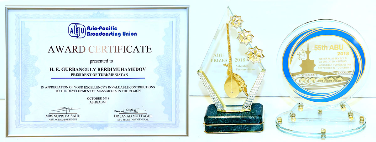 Upon completion of the meeting with the heads of the Asia-Pacific Broadcasting Union (ABU), the ABU Certificate, award and memorial sign were presented to the President of Turkmenistan for his contribution to the development of mass media in the region. The Chairperson of the Mejlis, high-ranking officials, the heads of military and law-enforcement agencies attended the awarding ceremony. ABU Secretary General Dr. Javad Mottaghi congratulated the President of Turkmenistan and all those present on opening of the 55th session of the ABU General Assembly in Ashgabat. The ABU Secretary General expressed gratitude to the President of Turkmenistan for the great interest in and support provided to the organization of the forum and creation the most favourable conditions and hospitality. It was noted that the organization of the meeting of the Asia-Pacific Broadcasting Union - an authoritative structure in the international media sphere in the Turkmen capital was stipulated, first of all, by the peace-loving policy pursued by President Gurbanguly Berdimuhamedov and the active support provided to the international media. One cannot help but admire Ashgabat - the pearl of Asia, where the forum participants have witnessed the formation of the exemplary systems of the modern information and news technologies. This proves that Turkmenistan will continue successfully developing and improving in this area, integrating into the global media space. According to Dr. Javad Mottaghi, it is a great honor for him to present the Certificate of the Asia-Pacific Broadcasting Union to President Gurbanguly Berdimuhamedov for the outstanding achievements in the development of mass media in the region. Thanking for the ABU Certificate, award and memorial sign in recognition of our country's contribution to the development of mass media, the President noted that this award vividly proved the international recognition of the country's efforts in the field of broadcasting. These awards stand as a symbol of confidence in the Turkmen state and the recognition of Turkmenistan’s achievements. Currently, much attention is paid to the development of this area in the country. President Gurbanguly Berdimuhamedov emphasized that the material and technical base of the industry had been consistently updated, and the special programmes on the advanced training of mass media specialists had been implemented in the country. In addition, the first national communication satellite TürkmenÄlem 52 ° E was launched that provided an opportunity to expand the broadcasting coverage. Moreover, cooperation with other countries, world news agencies and international organizations has actively developed. President Gurbanguly Berdimuhamedov underlined that Turkmenistan had become the venue for international conferences and various seminars that promote the mutual exchange of experience, serve as a platform for analyzing ideas with regard to joint creative projects. Noting that these days Ashgabat hosts the 55th session of the ABU General Assembly, the President of Turkmenistan expressed belief that the successful organization of the forum would vividly demonstrate that our neutral state is ready and open for the efficient international cooperation. Once again thanking for the recognition and support of Turkmenistan’s activities in the field of mass media, the President of Turkmenistan wished everyone good health and success in their responsible work.
