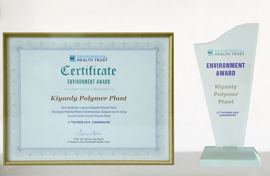 The certificates, proving the efficiency, innovativeness and ecological compatibility of the new production, were awarded to the polymer complex in Kiyanly during the opening ceremony. The enterprise will annually process five billion cubic meters of natural gas, that will be used for the production of 386,000 tons of high-density polyethylene and 81,000 tons of polypropylene. Special attention at this enterprise, operating based on the innovative technologies, is paid to the prevention of harmful effects on the environment, which is achieved through the use of the advanced waste gas filtration systems, their further utilization. Doctor of Agronomical and Horticultural Sciences of Julius Kühn-Institut German Federal Research Centre for Cultivated Plants, Margit Olle awarded the certificate “Innovations and Technologies”. Senior Advisor, the Environmental Health Foundation (USA) Robert Dubois Morris awarded the certificate for the environmental cleanliness of the large chemical enterprise. Chairman of the Energy Research Institute of the Paul Scherrer Institute (Switzerland), Urs Weidmann awarded the certificate “Stability and Efficiency”. Thanking the guests for the awards and certificates, President Gurbanguly Berdimuhamedov noted that he considered them as a sign of Turkmenistan’s high international rating, the recognition of our country’s achievements in the use of innovative technologies in the construction of various facilities. According to the President of Turkmenistan, a large-scale industrial programme, implemented in our country is inextricably linked with environmental issues. Supporting the efforts of the international community to reduce greenhouse gas emissions, Turkmenistan attaches great importance to the wide introduction of environmentally friendly and resource-saving technologies in industry, including in the oil and gas, electricity and chemical spheres.