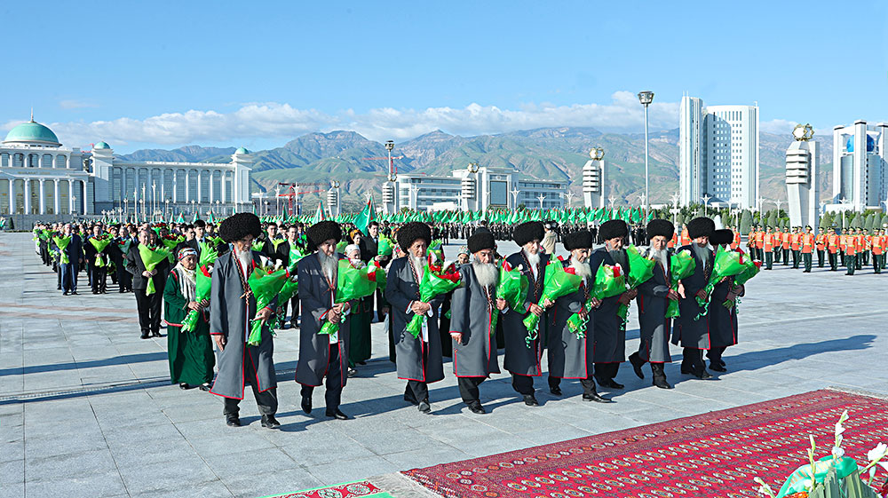 Independent neutral Turkmenistan marked the Day of Constitution and State Flag. The main events on occasion of remarkable date were held in the capital where flower laying ceremony to the Monument of Independence and the Main Flag of the country took place with the participation of President Gurbanguly Berdimuhamedov. The participants of the event included the members of the Government, leaders of the Mejlis, military and law enforcement agencies, ministries and departments, Hyakim of Ashgabat and heads of etrap administration of the capital and diplomatic missions accredited in Turkmenistan, elders, representative of public organizations, mass media, numerous residents and guests of the capital. Vehicle of the Head of the State came to decorated square in front of the Monument of Constitution. Everybody welcomed President Gurbanguly Berdimuhamedov with the enthusiasm. Girls in national dress presented flowers to Turkmen leader. The Head of the State went by carpet path along the line of the Guards of Honour to special place at the square in front of the Monument of Constitution. National anthem of the country was played. Turkmen leader laid flowers to the Monument of Constitution, which embodies the sanctity of the foundations of democratic, temporary state and solidarity of Turkmen nation. President Gurbanguly Berdimuhamedov highlighted in his greeting speech on occasion of remarkable holiday that the Main Law of the country and the State Flag flying in height are national heritage indicating glorious past, happy present and light future, which reflects our solidarity. After the President of Turkmenistan, members of the Government, deputies of the Mejlis, heads of military and law enforcement agencies, ministries and departments as well as all participants of the events laid flowers to the Monument of Constitution. After flower laying ceremony to the Monument of Constitution, the events have moved to the square with 133-meter flagpole hoisting the Main Flag of Turkmenistan. Vehicle of the President arrived to the square in front of the flagpole. The participants greeted Turkmen leader. The culmination came and President Gurbanguly Berdimuhamedov put beautiful wreath to the podium of giant flagpole. Following the Head of the State, the Speaker and deputies of the Mejlis, deputy Chairmen of the Cabinet of Ministers and other participants of the ceremony laid flowers. Our ancestors used to say that a man is recognized by education while the country by flag. It has special meaning. Due to peace-making policy of Turkmenistan and the course toward wide international cooperation, the flag of our country is recognized as a symbol of the state, which is committed to the principles of neutrality, peace and humanity. Today, Turkmenistan takes deserved place in the world community. We have an open way to happy future but we have to work hard to deserve it, President Gurbanguly Berdimuhamedov highlights in his speeches. Hero of Turkmenistan, Prize Winner of Magtumguly Award Gozel Shaguliyeva was among the participants of current event. Having warmly greeted famous poet, the President expressed the interest how she is doing. Having noted that talented master glorifies the achievements of the country and success of Turkmen nation with high professionalism, the Head of the State expressed the gratitude to the poet for her work and wished her great success. Upon the completion of the ceremony, President Gurbanguly Berdimuhamedov said goodbye to the participants and left the place of event. Celebration events on occasion of the Day of Constitution and State Flag of Turkmenistan were held all over the country.