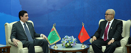 On April 12, President of Turkmenistan Gurbanguly Berdymuhamedov, who was on a visit to the Republic of Korea to take part in the VII World Water Forum, met with Prime Minister of the Kingdom of Morocco Abdelilah Benkirane. Having expressed satisfaction with the opportunity to discuss the priority aspects of bilateral partnership during the personal meeting, the President of Turkmenistan and the Prime Minister of the Kingdom of Morocco focused on the key areas of mutually advantageous cooperation, given the accumulated experience and multi-aspect potential available. In the course of the meeting, Prime Minister Abdelilah Benkirane gave a high appraisal to Turkmenistan’s peace policy based on the principles of positive neutrality, which had become an important factor of stability in the Central Asian region. The head of government of the Kingdom of Morocco also expressed full support for the constructive international initiatives of the head of Turkmen state, successively put forward from the rostrum of the United Nations and aimed at maintaining global peace and security, joining efforts to solve economic, social and environmental issues. During the meeting, the parties noted the two countries’ interest in establishing all-round cooperation, and concretized the priorities of mutually advantageous partnership. The sphere of investments, the trade-economic field, the recreation and tourist industry were outlined among promising areas of partnership. Placing special emphasis on the willingness to advance a humanitarian dialogue, President Gurbanguly Berdymuhamedov and Prime Minister Abdelilah Benkirane spoke in favor of strengthening and expanding cultural, scientific and educational contacts between Turkmenistan and the Kingdom of Morocco. Concluding the meeting, the parties expressed confidence that the Turkmen-Moroccan relations would successfully develop on the basis of goodwill of the two friendly countries’ peoples and the potential available for interstate cooperation.