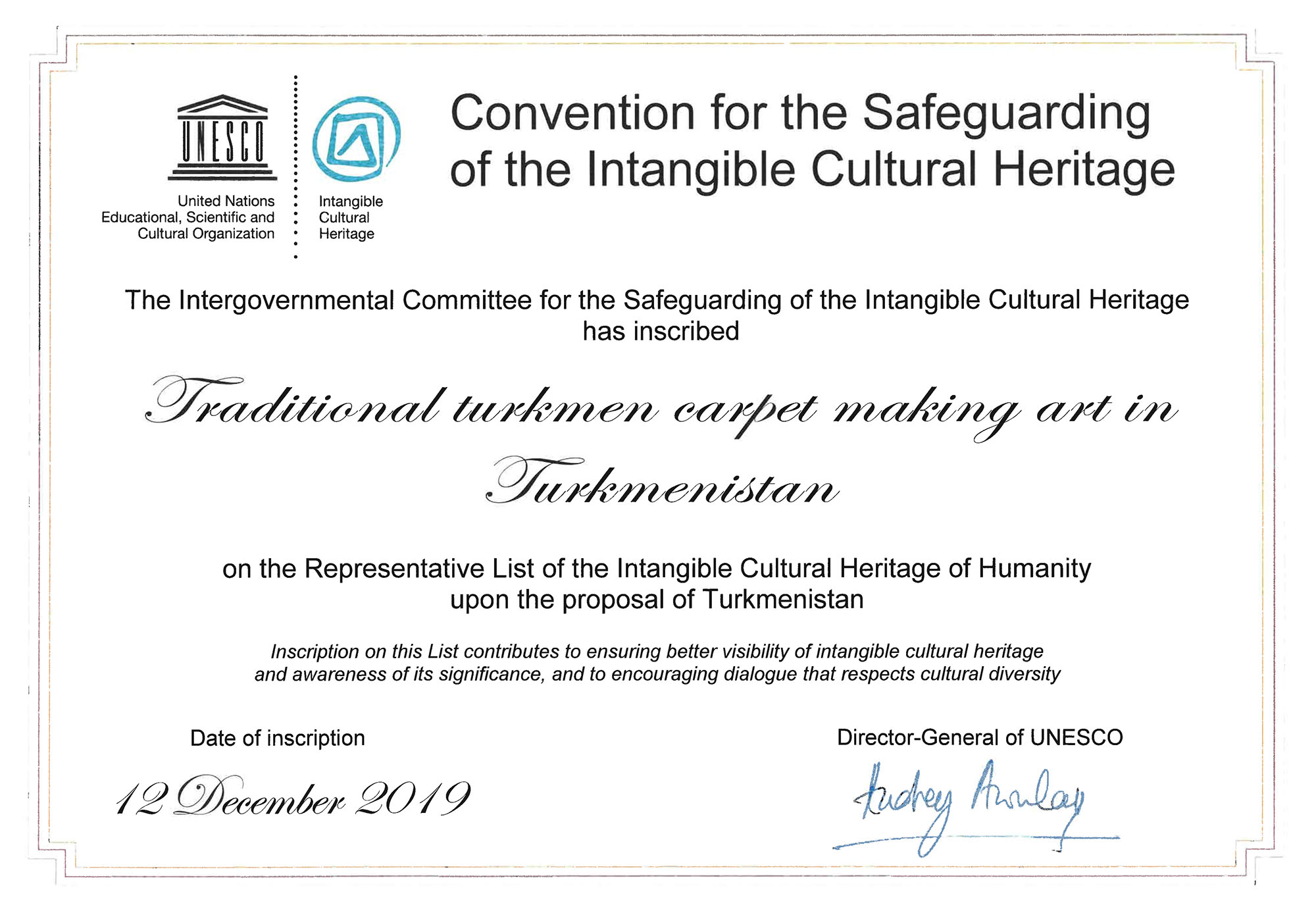 The UNESCO General Director Audrey Azoulay has sent official mail with original of the certificate on inclusion of Turkmen national carpet making art to the Representative List of Intangible Human Heritage to the Government of Turkmenistan. It has been already informed to TDH that this decision has been made at the session of the 14th session of the Intergovernmental Committee for Protection of the UNESCO Intangible Cultural Heritage, which was held in Bogota, the capital of Columbia in December 9 – 14, 2019. On the day before Nowruz Bayramy, the certificate proving historical importance and value of traditions of Turkmen carpet making art as part on human cultural heritage has been delivered to Ashgabat. Turkmenistan and the UN, in particular the UN Educational, Scientific and Cultural Organization (UNESCO), are connected with old and fruitful partnership. The results of this partnership include entering of historical and cultural reserves of Ancient Merv, Kunyaurgenc and Ancient Nisa to the World Heritage List, Gyorogly destan, ritual dance Kushtdepdy to the UNESCO Representative List of Intangible Human Heritage. The Head of the State declared deep study of spiritual and cultural heritage of Turkmen nation, careful protection and enrichment of ancient traditions among the priorities of the state policy. Our country pays special attention to development of carpet making art, scientific studies in the sphere of its history, popularization of Turkmen carpets. Equipment and facility base of the carpet making industry is strengthened, new carpet making facilities are put into operation, conditions for efficient work and proper recreation of carpet makers has been established and permanently improved.