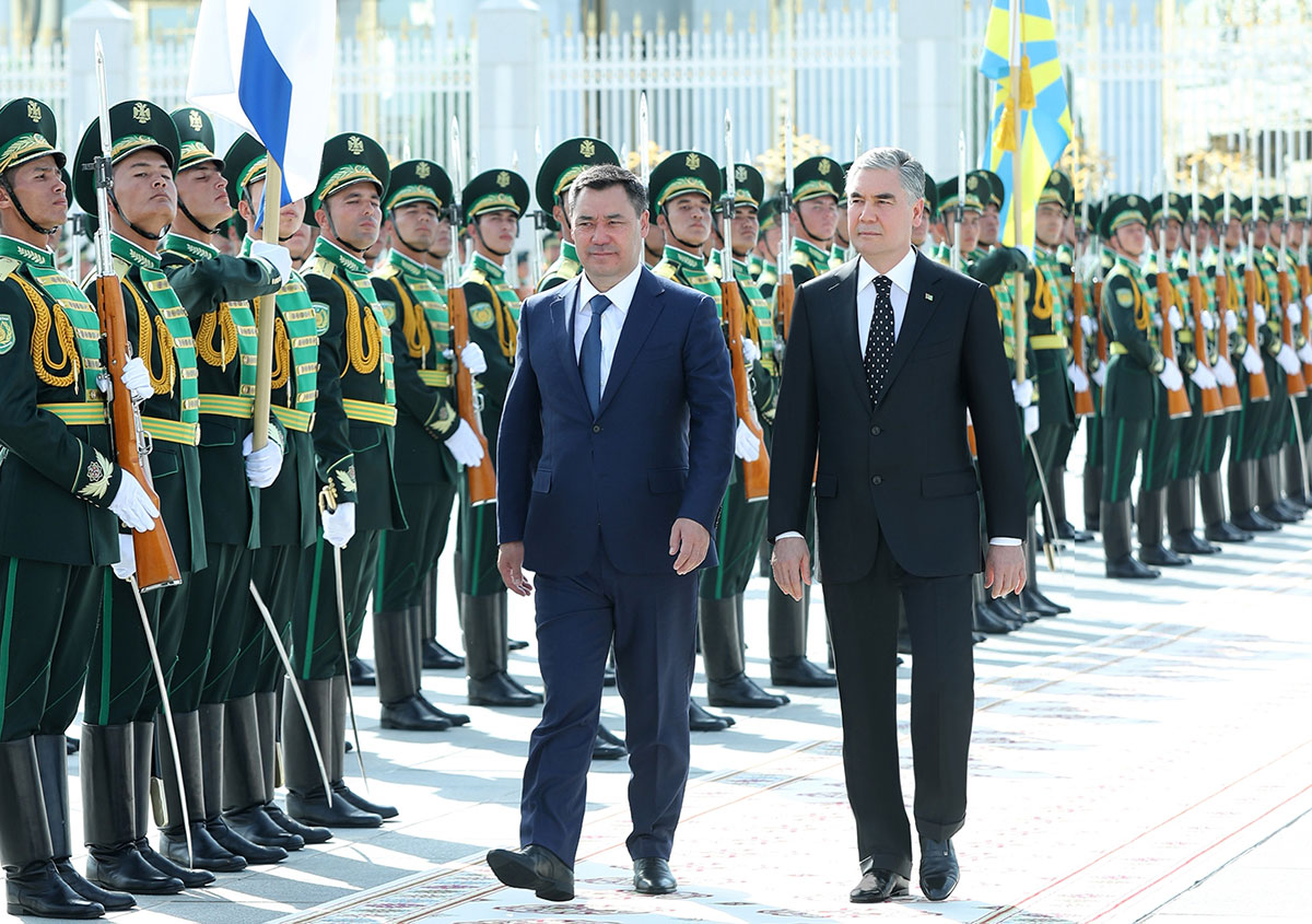 The company commander of the Guard of Honor has made his report. National anthems of the Kyrgyz Republic and Turkmenistan were played. The leaders of two countries have walked along the line of warriors of the Guard of Honor and paid tribute to the State Flag of Turkmenistan.