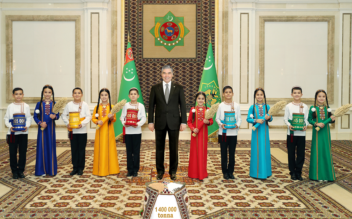 Having congratulated the leader of the nation on the remarkable event - successful completion of the grain-harvesting season - children presented President Gurbanguly Berdimuhamedov with symbolical gifts - "bouquets" of healthy ears of the ak bugday.