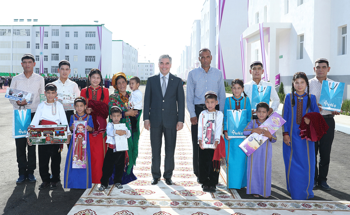 Congratulating the hosts on the new home and presenting gifts, President Gurbanguly Berdimuhamedov wished them a happy life in a new home, family well-being, health and success. After joint photographing, the new settlers presented the head of state with a traditional holiday gift for the Turkmen people - "toý düwünçek".
