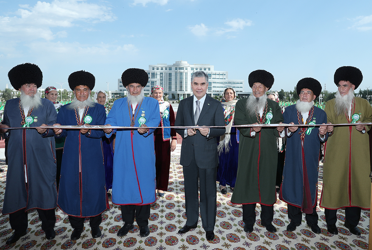 To the thunderous applause of those present, President Gurbanguly Berdimuhamedov, together with the honorary elders, cuts the symbolic ribbon in front of the Türkmeniň ak öýi door.