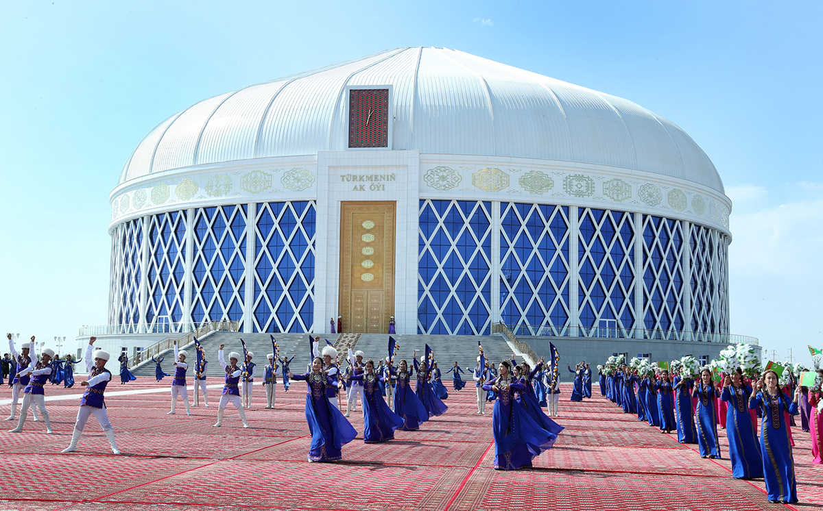 A festive atmosphere reigns in the square in front of the Türkmeniň ak öýi building, where numerous participants of the celebration gathered on this significant day.