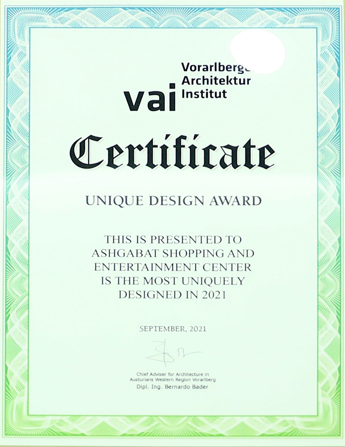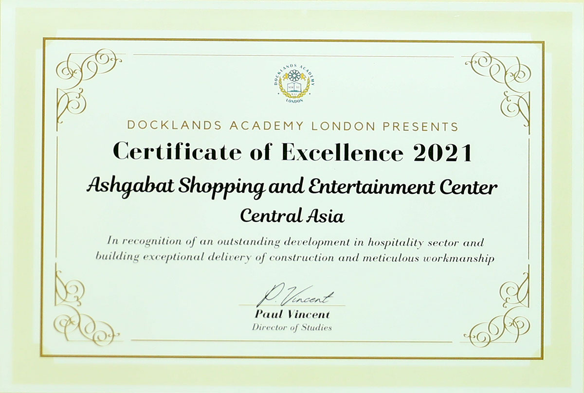 Focusing attention on the advantage of the modern Shopping mall, Paúl Vincent noted that this object is unique by its architectural embodiment and answers all parameters of classification of similar multipurpose complexes. Taking into account the factor a new capital object was awarded with the "Certificate of Excellence 2021".