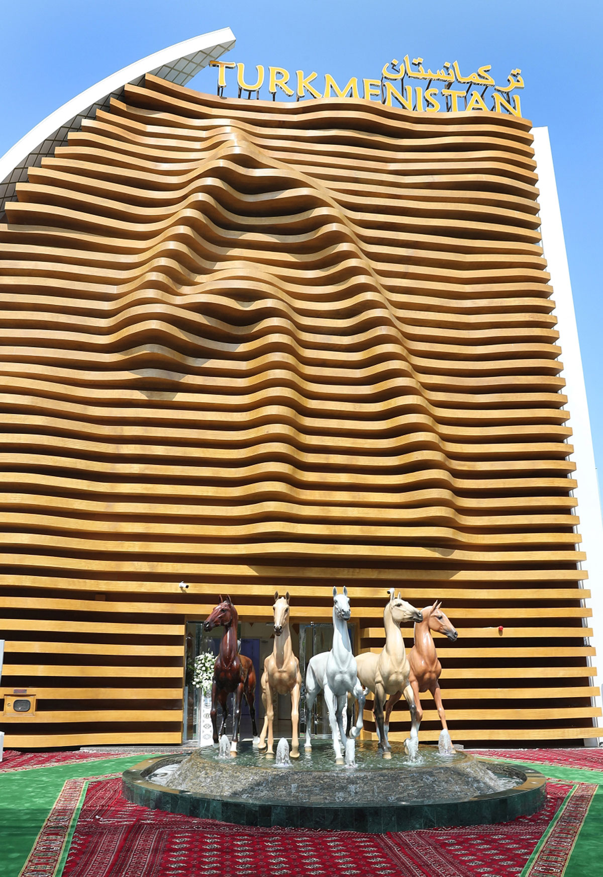 A distinctive feature of the Turkmen pavilion is harmonious combination of elements of national decor and advanced technologies. Moreover, the thematic accent, along with the Akhal-Teke horses, is put on another bright symbol of our country - the Turkmen carpet. Its large-scale image is also placed on the outer side of the building. The expressiveness of carpet styling is emphasized by spectacular lighting.