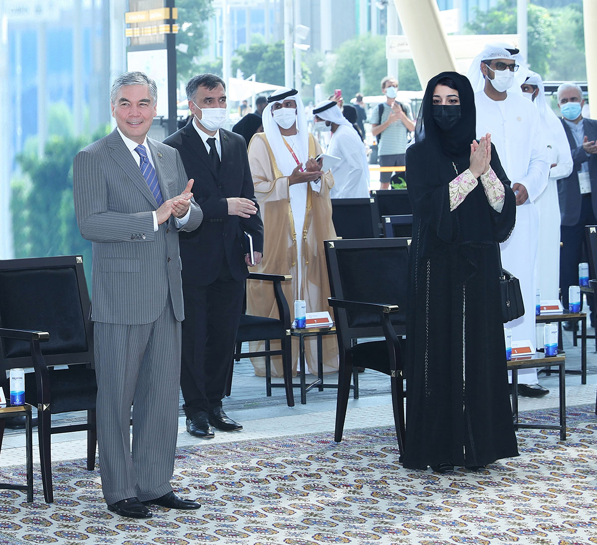 Then the head of state, accompanied by Energy Minister Suhail Mohamed Al Mazrui and UAE Minister of State for International Cooperation, Director General of the EXPO 2020 World Exhibition Rimal Al Hashimi, proceeded to the national pavilion of Turkmenistan.