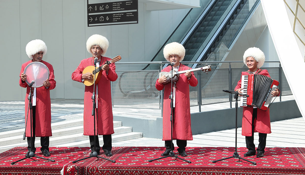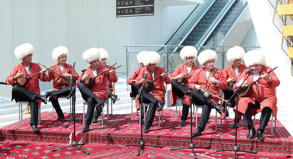 At the end of the acquaintance with the national pavilion for President Gurbanguly Berdimuhamedov and the participants of the ceremony, the ensemble of dutarists of the Turkmen National Conservatory named after Mai Kuliyeva sounded wonderful folk melodies, which became a colorful musical background of the National Day of our country at EXPO-2020.