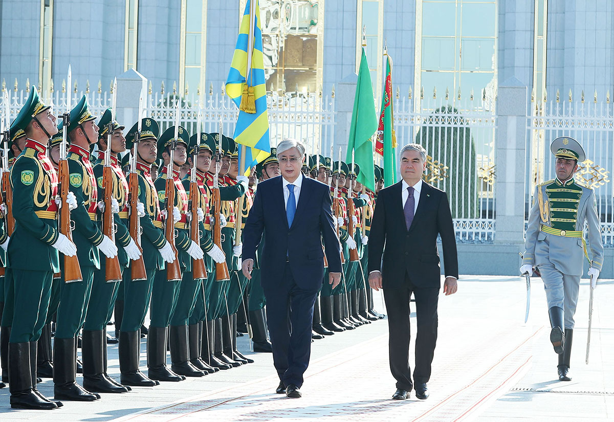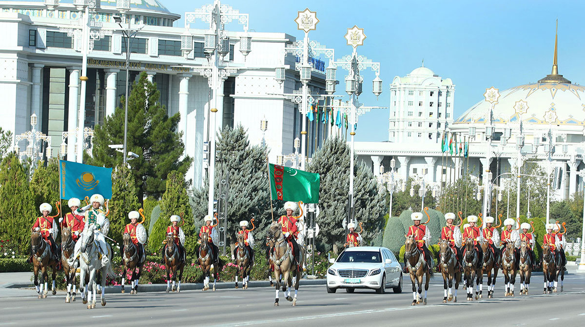 Solemnly the commander of the company of the Guard of honour reports. National anthems of the Republic of Kazakhstan and Turkmenistan play. Presidents Gurbanguly Berdimuhamedov and Kassym-Jomart Tokaev pass by the line of soldiers of the Guard of honour and pay a tribute of respect to the National flag of Turkmenistan.