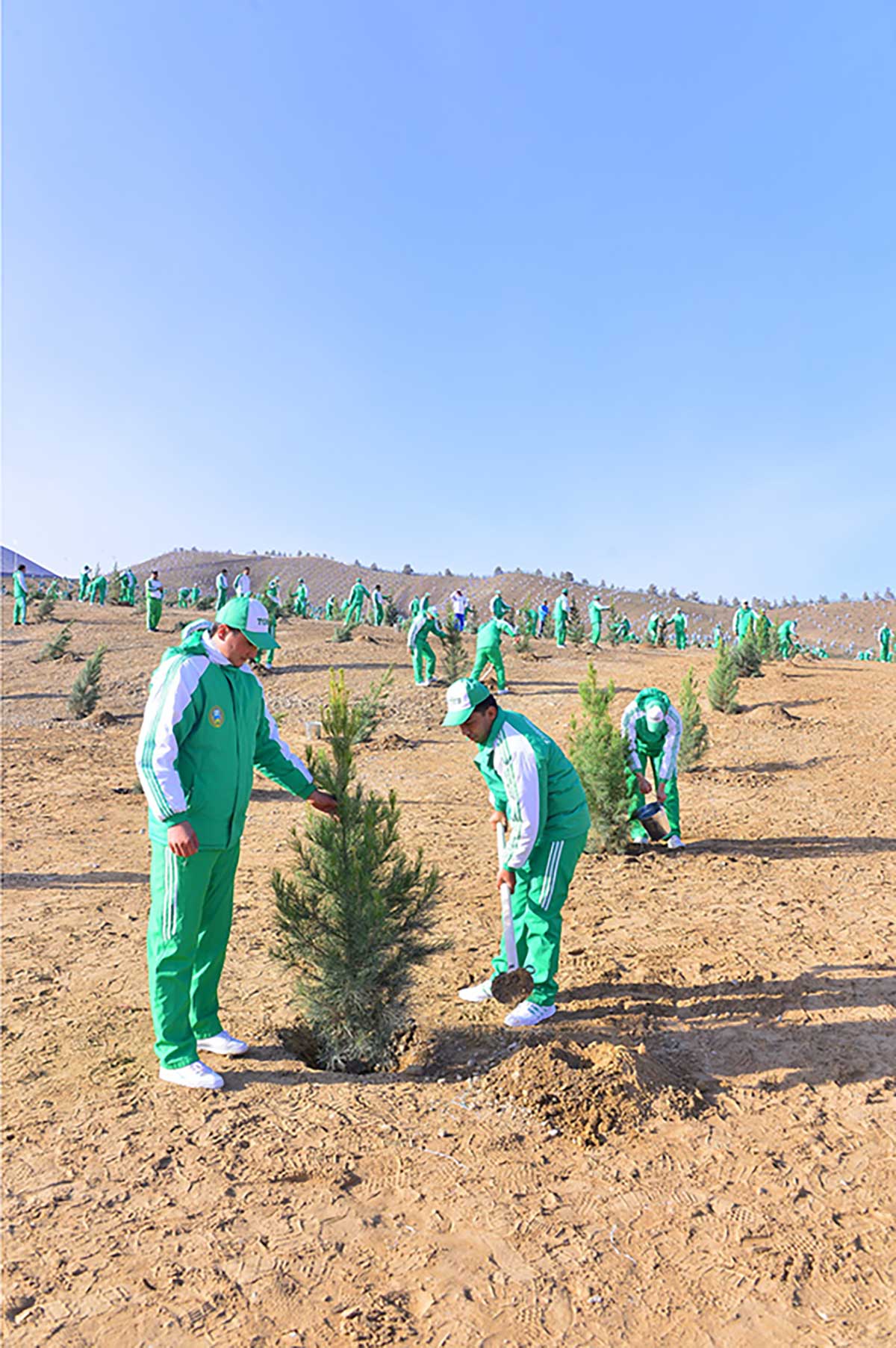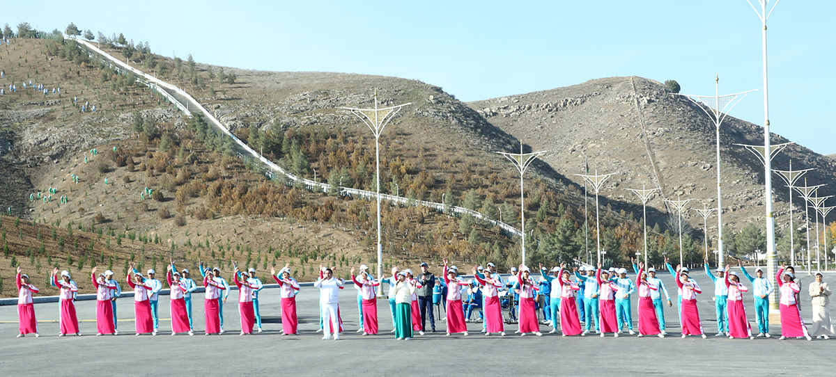 The representative of the younger generation of the country approaches the head of the state. A sonorous voice of a boy welcomes the leader of the nation, wishing health and big successes in his many-sided activity. At the desire of the child, the President of the country starts the tree planting campaigns and plants the first tree - Turkmen juniper that is important in restoration of woods in the mountain regions of our Fatherland.
