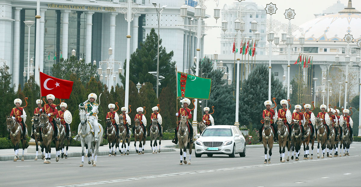 The company commander of the Guard of Honor solemnly reports. The National Anthems of the Turkish Republic and Turkmenistan are performed.