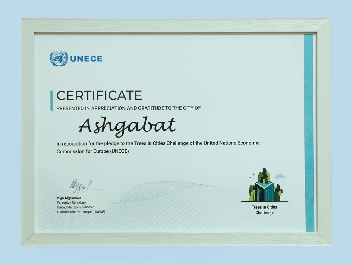 In this connection, it was informed that the international certificate given to Ashgabat city for assistance and contribution to the initiative of the United Nations Economic Commission for Europe “Trees in cities” by tree planting actions was sent by Deputy Secretary-General of the UN , Executive Secretary of the United Nations Economic Commission for Europe .
