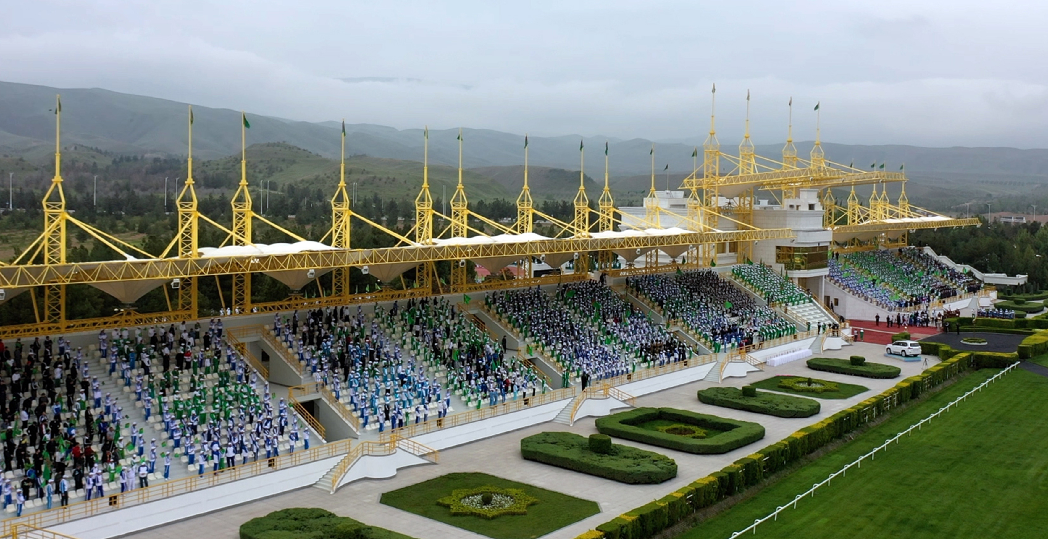 The car of the head of state Serdar Berdimuhamedov drives up to the Akhal-Teke equestrian complex of the President of Turkmenistan.
