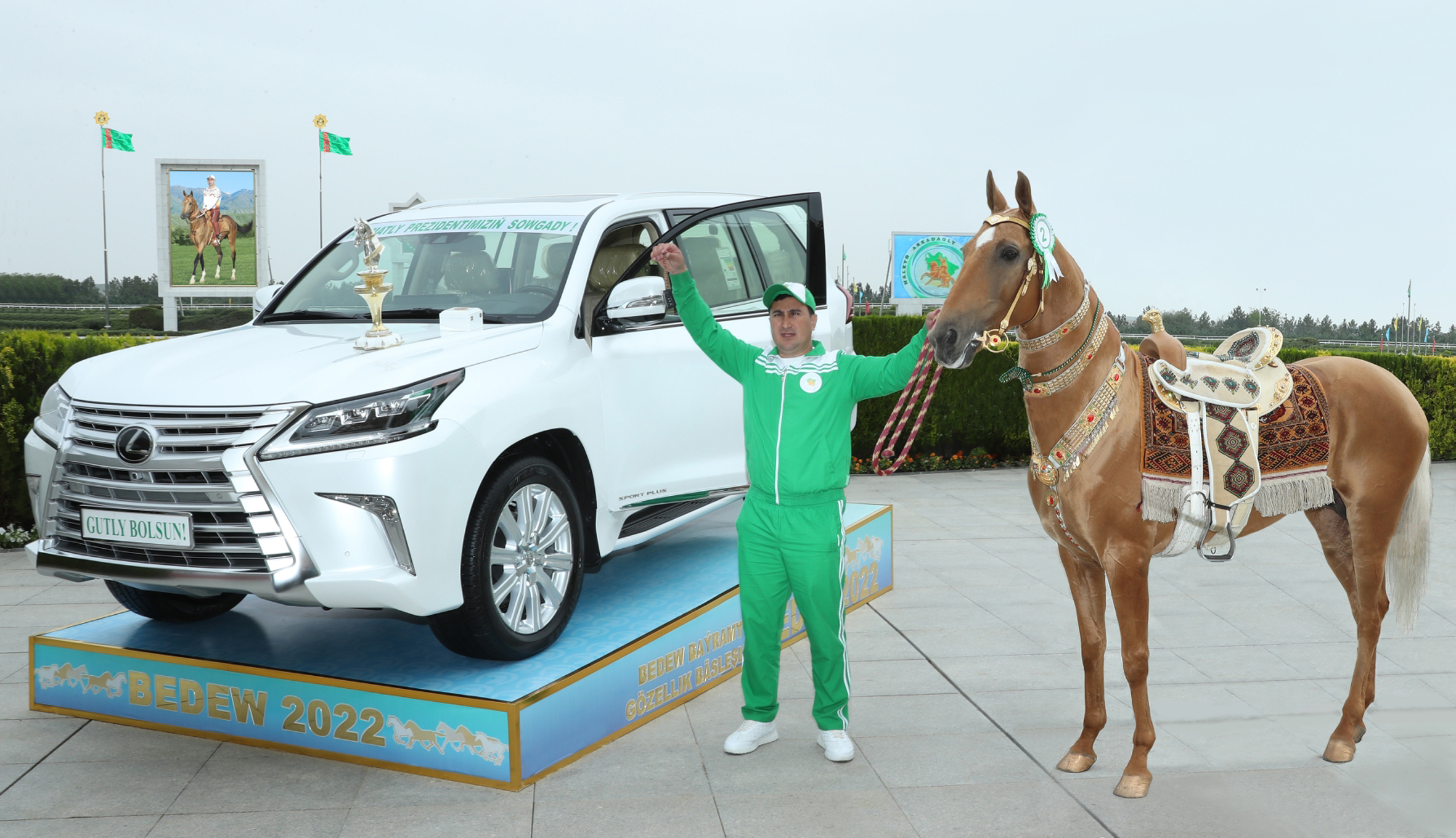The most beautiful Akhal-Teke horse of 2022 was recognized as the magnificent horse Melebash from the Akhal-Teke Equestrian Complex of the President of Turkmenistan, a descendant of Gerden and Elgamak, belonging to the line of the famous horse named Gyrsakar, born in 2015. On behalf of President Serdar Berdimuhamedov, his seyis B. Juraev was awarded the main prize - the keys to a Lexus car, a challenge cup and a diploma.