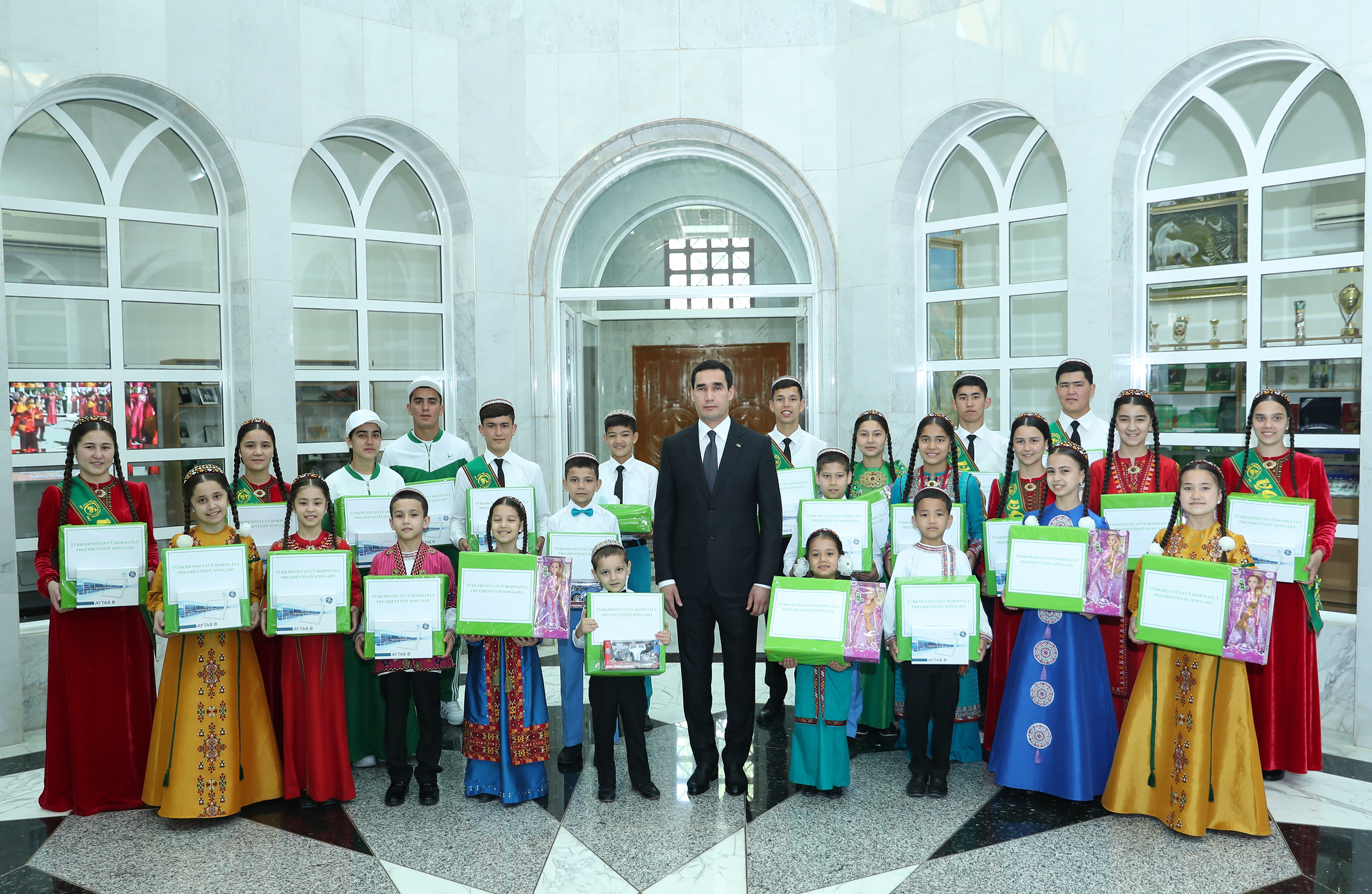 Further, on the occasion of the holiday, on behalf of President Serdar Berdimuhamedov children of the «Döwletliler köşgi» Palace were presented with gifts, which were received by them with great joy.
