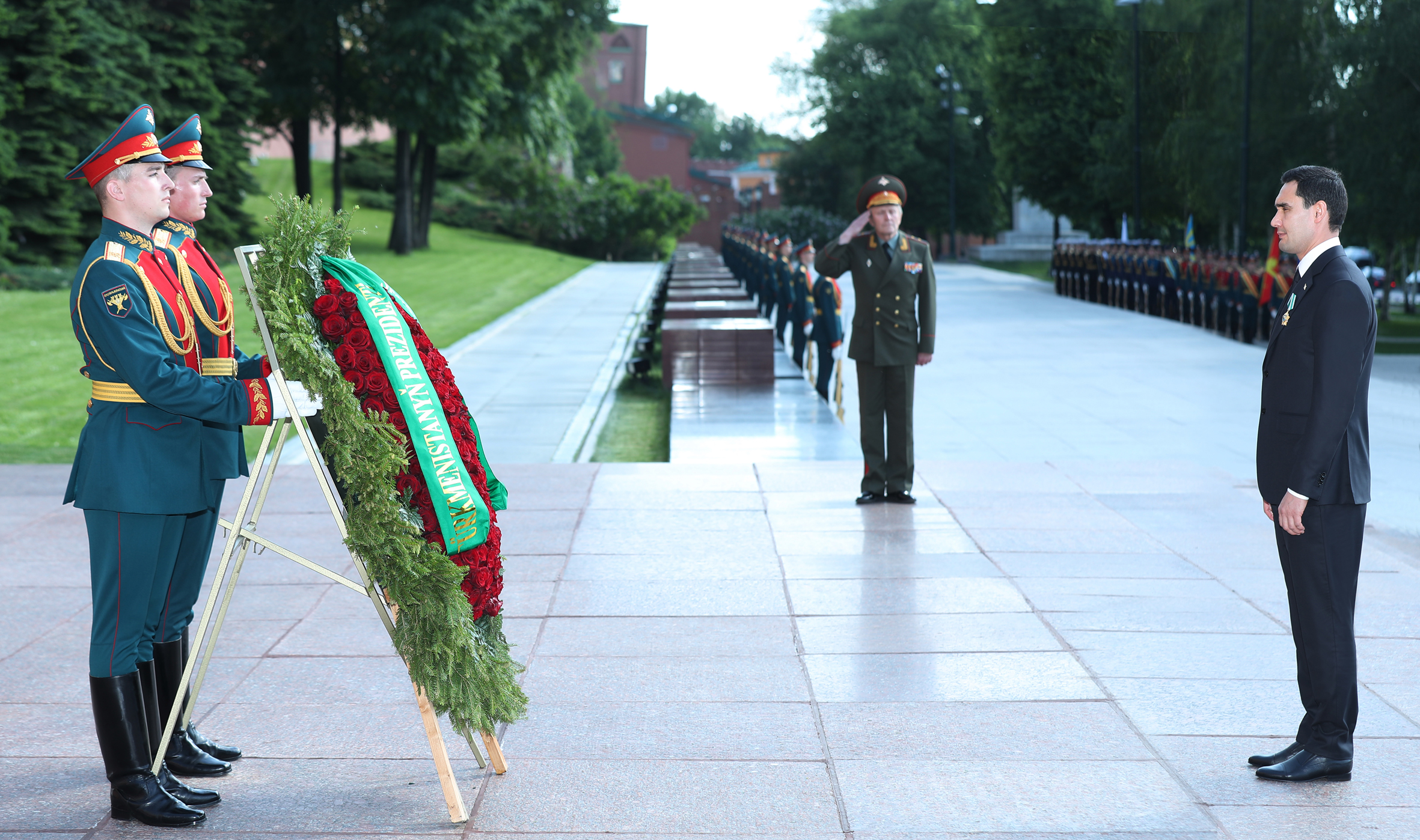 At the end of the press conference, President Serdar Berdimuhamedov proceeded to the memorial complex located in the Alexander Garden, near the Kremlin Wall. Paying tribute to the heroes who fell in the battle against fascism on the fields of the Great Patriotic War of 1941-1945, the head of Turkmenistan laid flowers at the Eternal Flame at the Grave of the Unknown Soldier.
