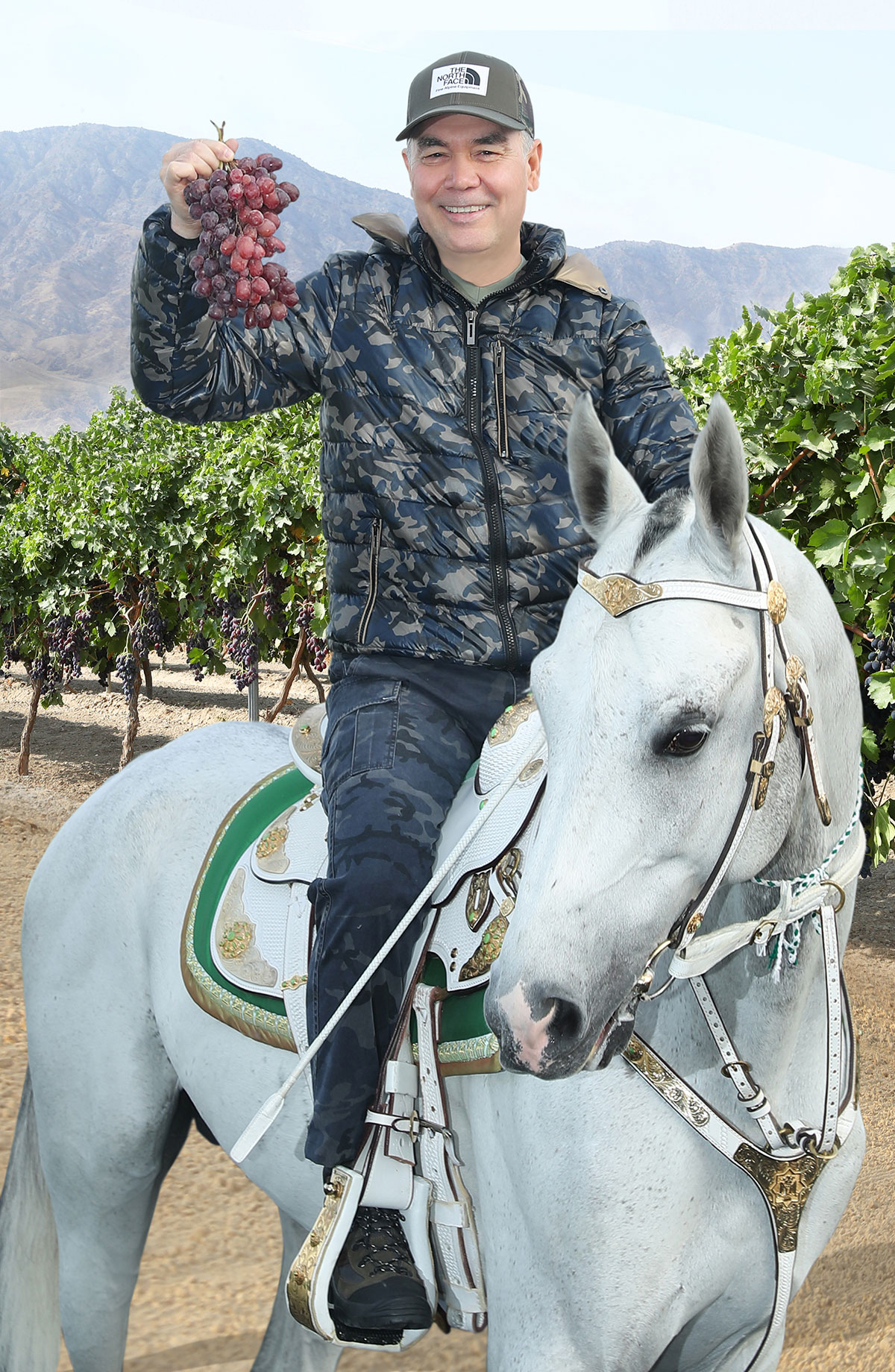 Arkadag continued horseback riding among the vineyards of the Economic Department of military and law enforcement agencies, located near the new administrative center of the velayat. Here, vineyards and fruit trees are properly cared for, so they give a good harvest.